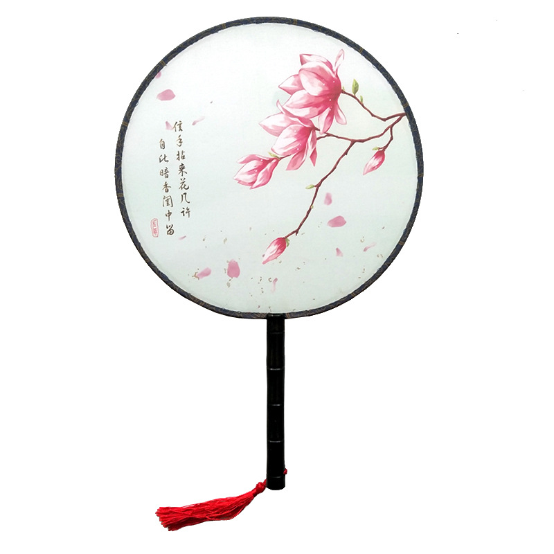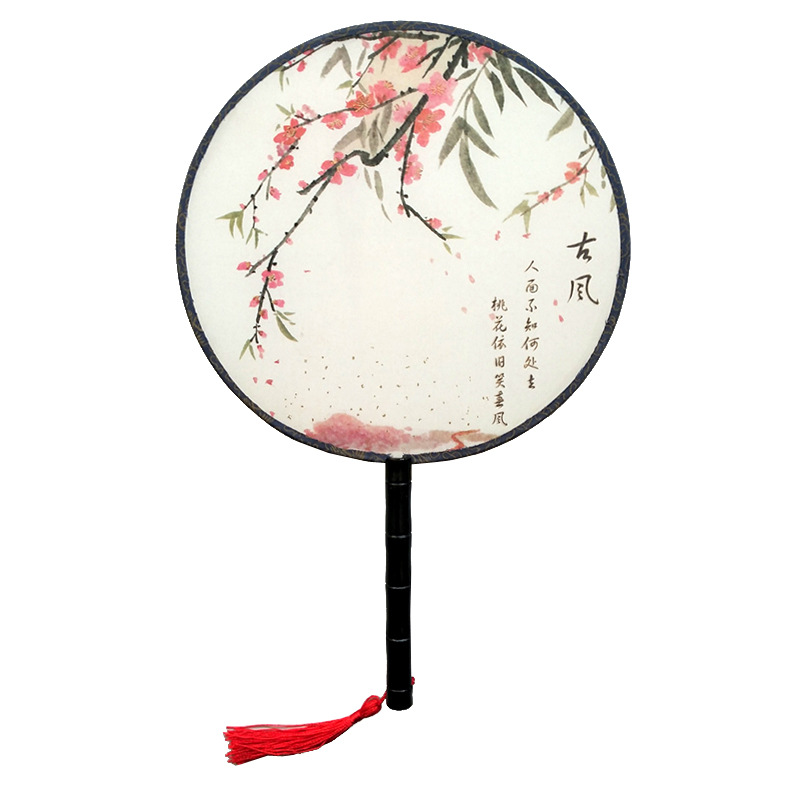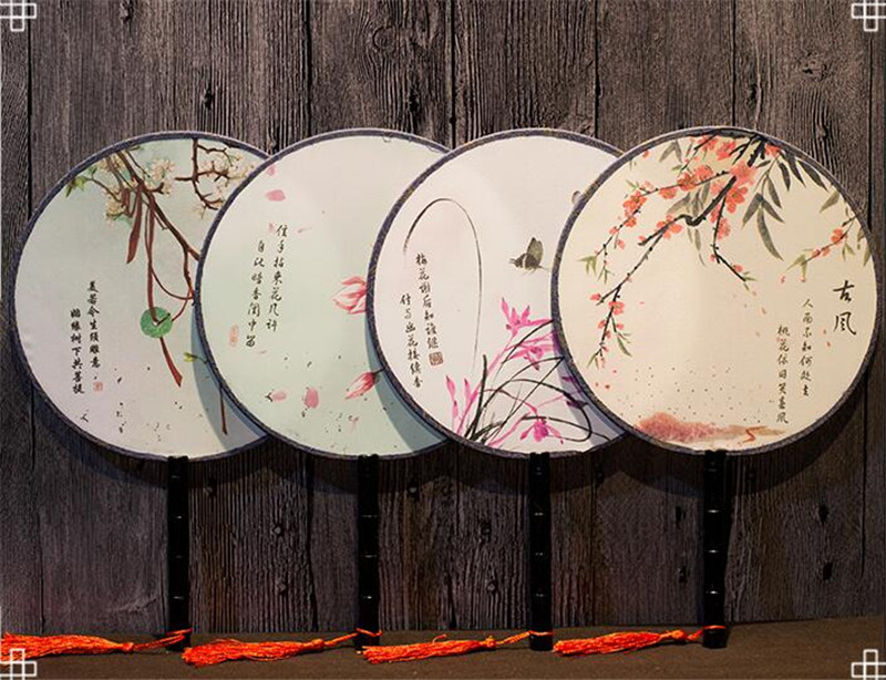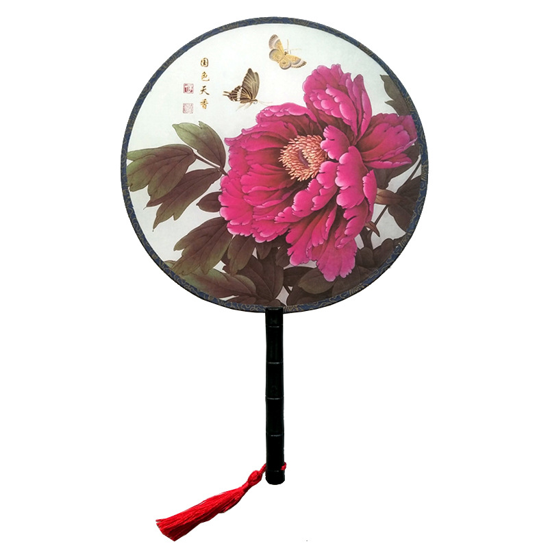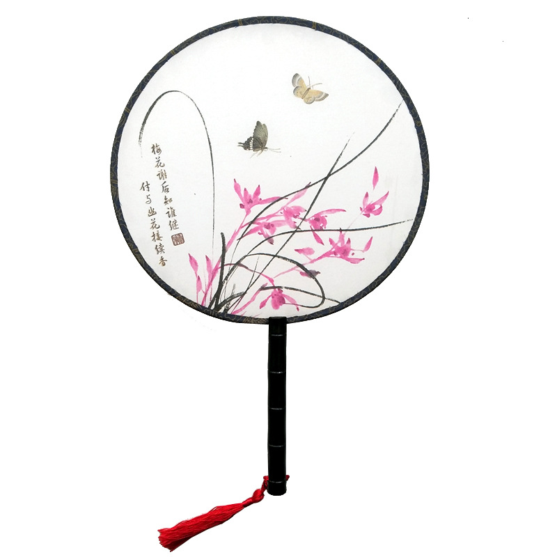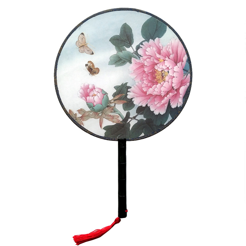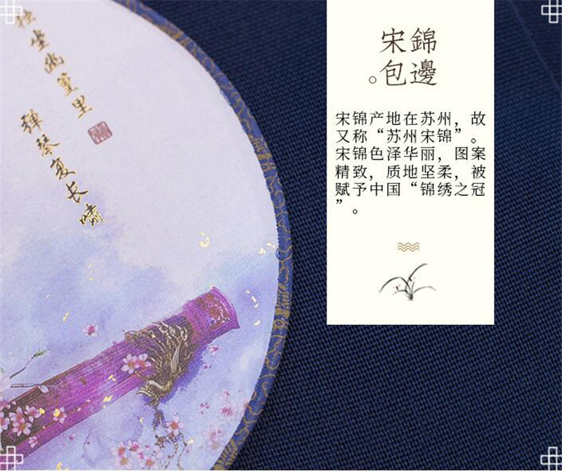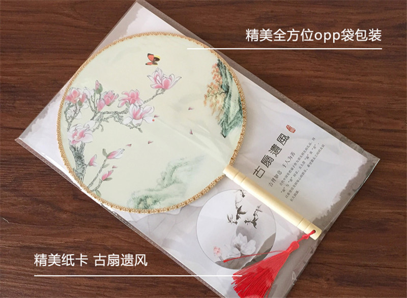 材料;扇面仿真丝,全手工制作,手柄木质,里框铁丝,包边苏锦编织而成 |