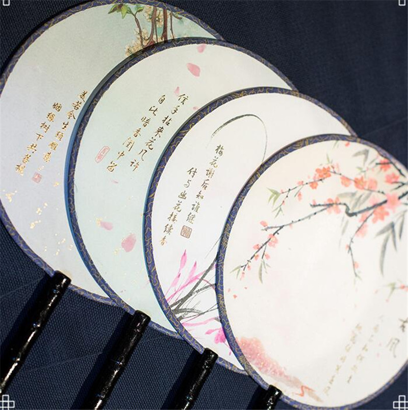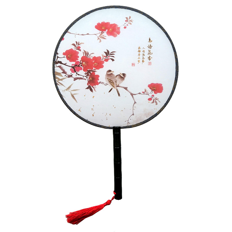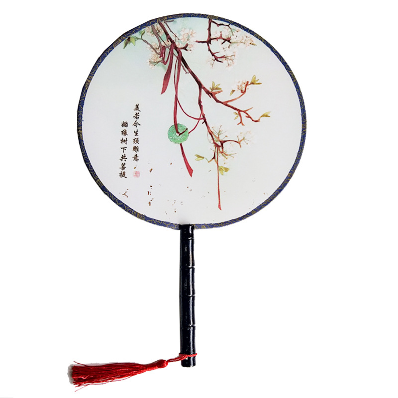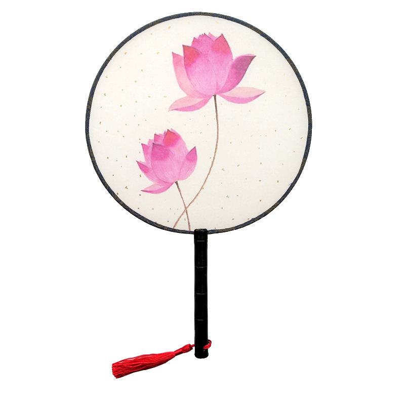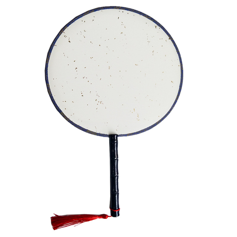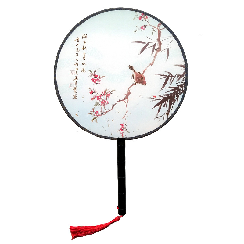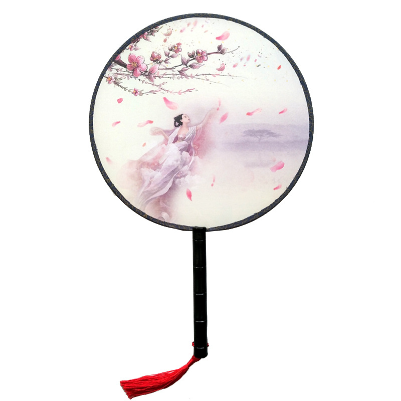 材料;扇面仿真丝,全手工制作,手柄木质,里框铁丝,包边苏锦编织而成 |