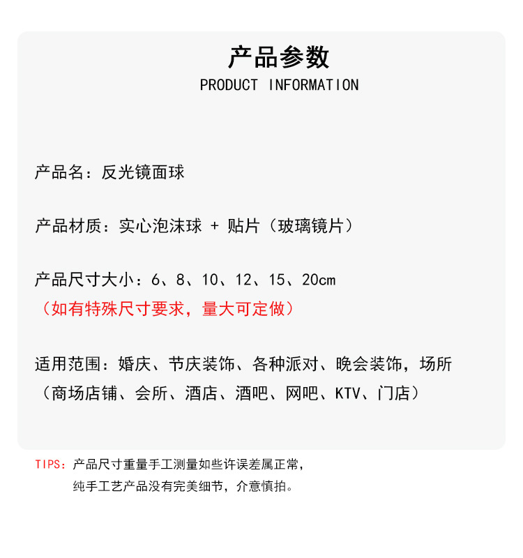 | Color | Bola espejo rojo de 6cm (2 / grupo), bola espejo rojo de 8cm (2 / grupo), bola espejo rojo de 10cm (1 / grupo), bola espejo rojo de 12cm (1 / grupo), bola espejo rojo de 15cm (1 / grupo), bola espejo rojo de 20cm (1 / grupo), bola espejo rojo de 30cm (1 / grupo), bola espejo dorado de 6cm (2 / grupo), Bola espejo dorado de 8cm (2 / grupo), bola espejo dorado de 10cm (1 / grupo), bola espejo dorado de 12cm (1 / grupo), bola espejo dorado de 20cm (1 / grupo), bola espejo dorado de 30cm (1 / grupo)1 / grupo), 6 cm Silver Mirror Ball (2 / grupo), 8 cm Silver Mirror Ball (2 / grupo), 10 cm Silver Mirror Ball (1 / grupo), 12 cm Silver Mirror Ball (1 / grupo), 15 cm Silver Mirror Ball (1 / grupo), 20 cm Silver Mirror Ball (1 / grupo), 30 cm Silver Mirror Ball (1 / grupo) |