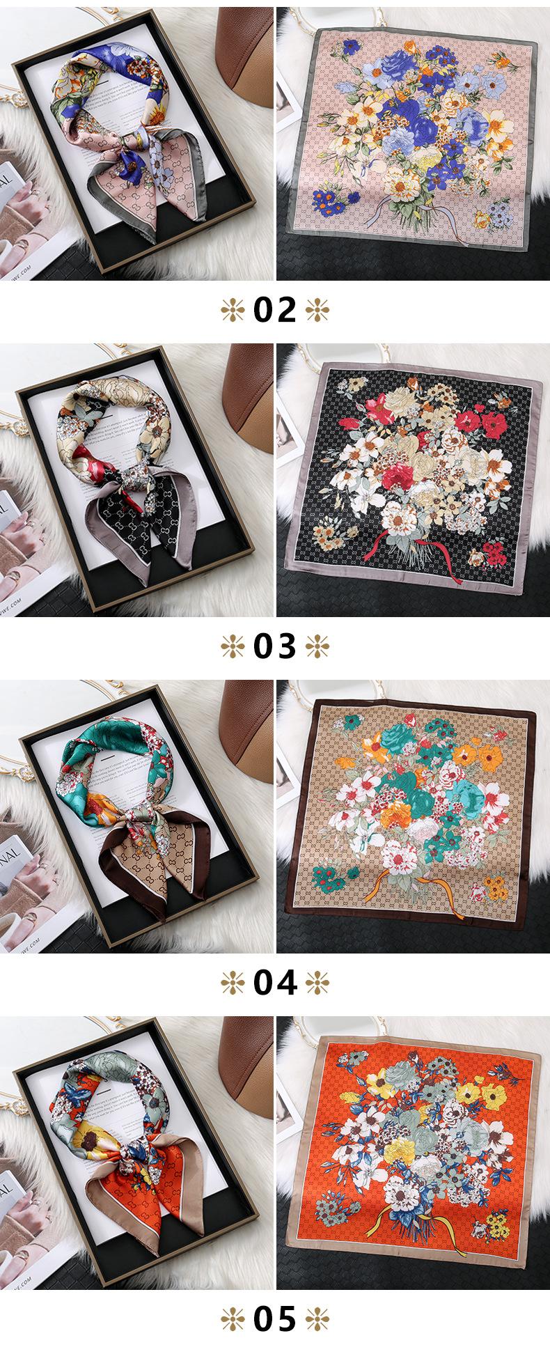 | 03 | Pañuelos de seda de flores y flores |