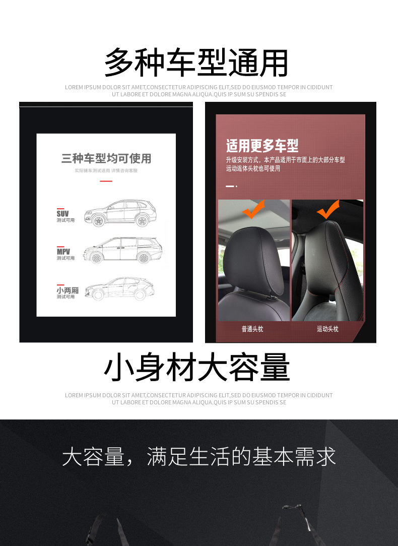 【安装方法】:将收纳袋拿出对比安装位置,用卡扣固定在头枕下即可。
