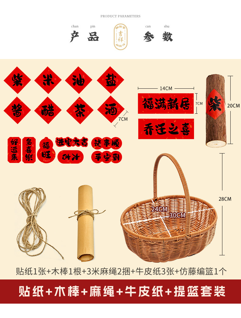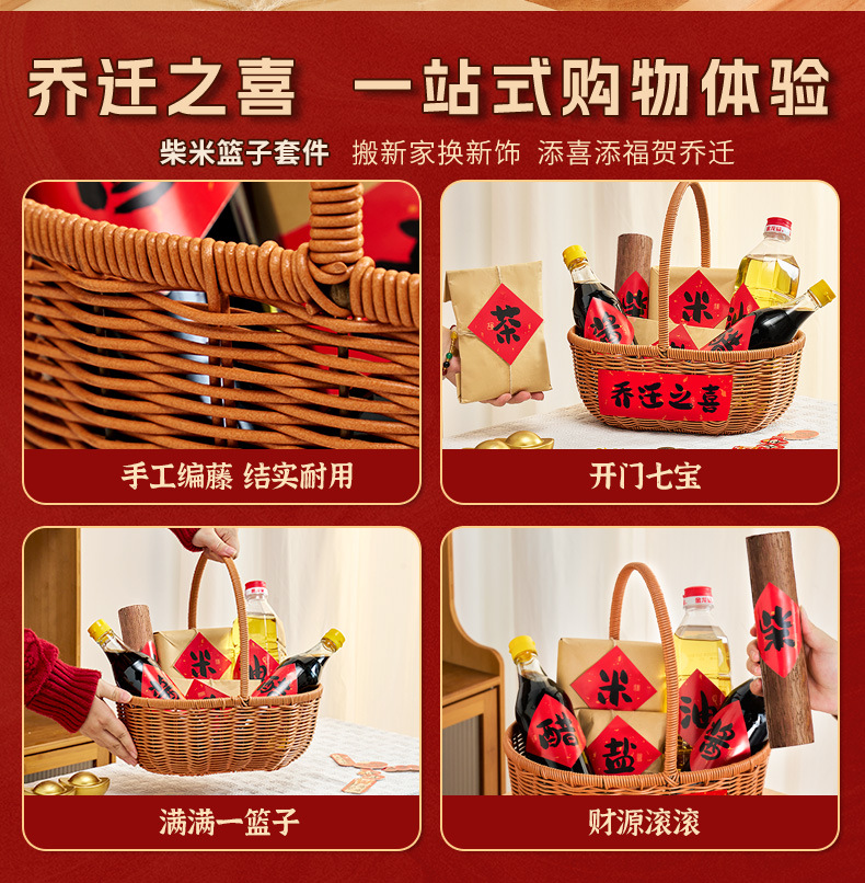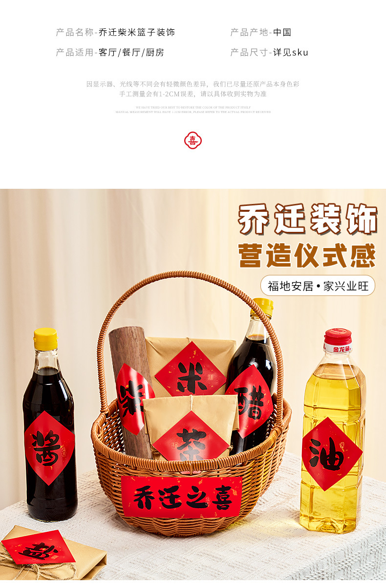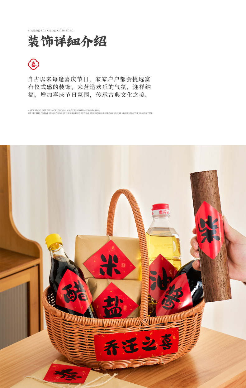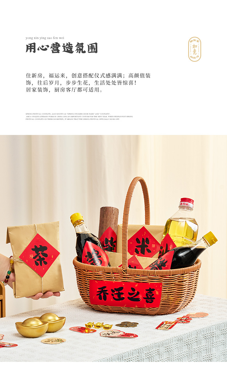 La alegría de la inauguración de la casa, pegatinas decorativas, leña, arroz, aceite, sal, salsa, vinagre, té, cestas tejidas a mano, bricolaje, suministros para la ceremonia de entrada al nuevo hogar
