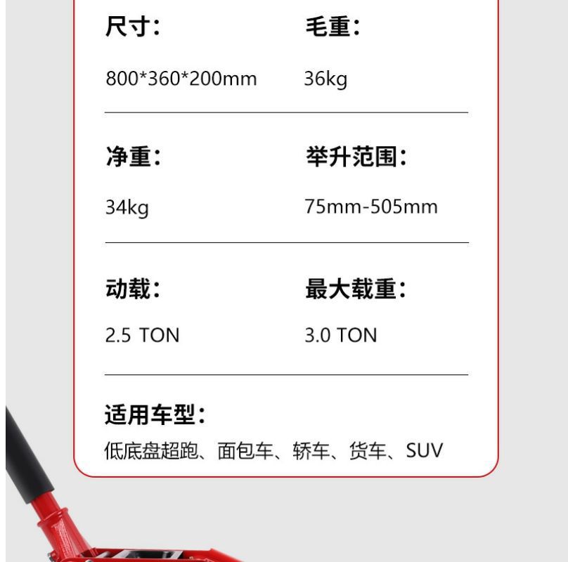 | Modelo | Maquinaria del Sur 2,5 toneladas de jack, maquinaria del Sur 2,5 toneladas de Jack + bolsa de tela de oxford, maquinaria del Sur 2,5 toneladas de Jack + llave de neumáticos, maquinaria del Sur 2,5 toneladas de Jack + bolsa de tela de Oxford + rueda, maquinaria del Sur 3 toneladas de doble bomba horizontal súper baja, maquinaria del Sur 3 toneladas de doble bomba horizontal súper baja + tracción cruzada, maquinaria del Sur 3 toneladas de doble bomba horizontal súper baja + llave cruzada, maquinaria del Sur 3 toneladas de doble bomba horizontal súper baja + caída lenta + 1, maquinaria del Sur 3 toneladas de doble bomba horizontal súper baja + soporte de seguridad, maquinaria del Sur 3 toneladas de doble bomba horizontal súper baja + elevación horizontal súper baja + caída lenta, Taian gramo 3 toneladas de doble bomba horizontal ultra bajo + 2 soportes de Seguridad |