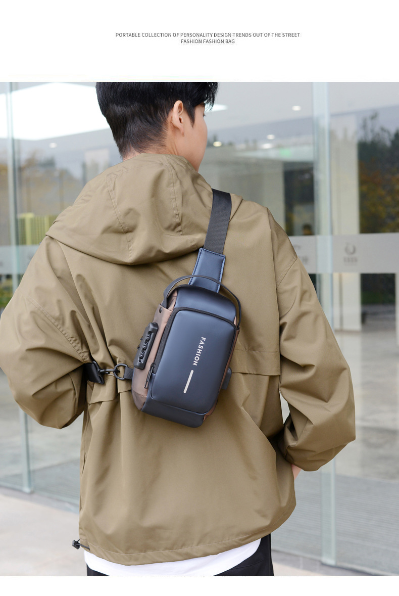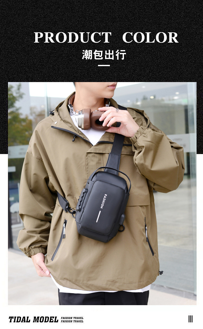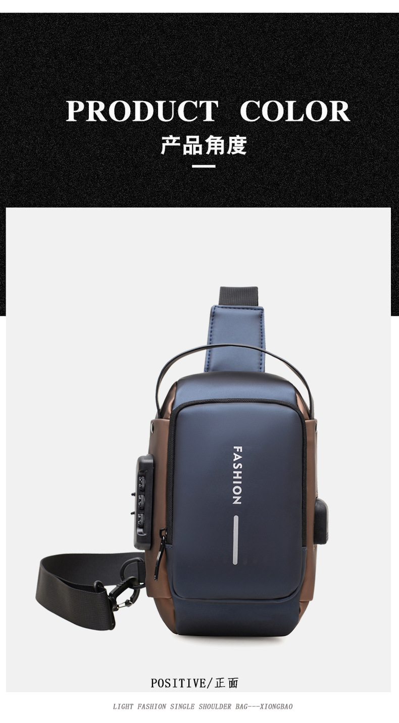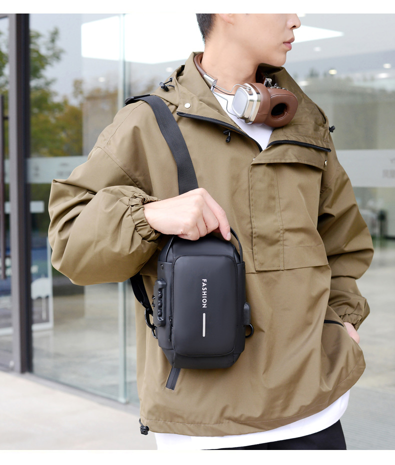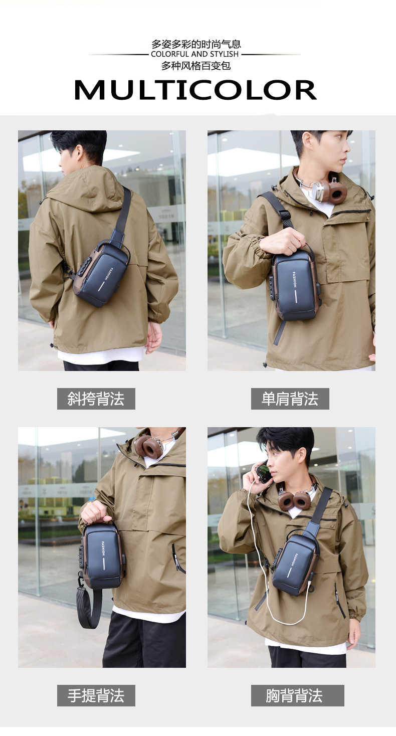 Carga USB explosión de estilo de moda de tramo oblicuo mochila deportiva anti-robo mochila pequeña multifuncional contraseña bloqueo bolso de pecho