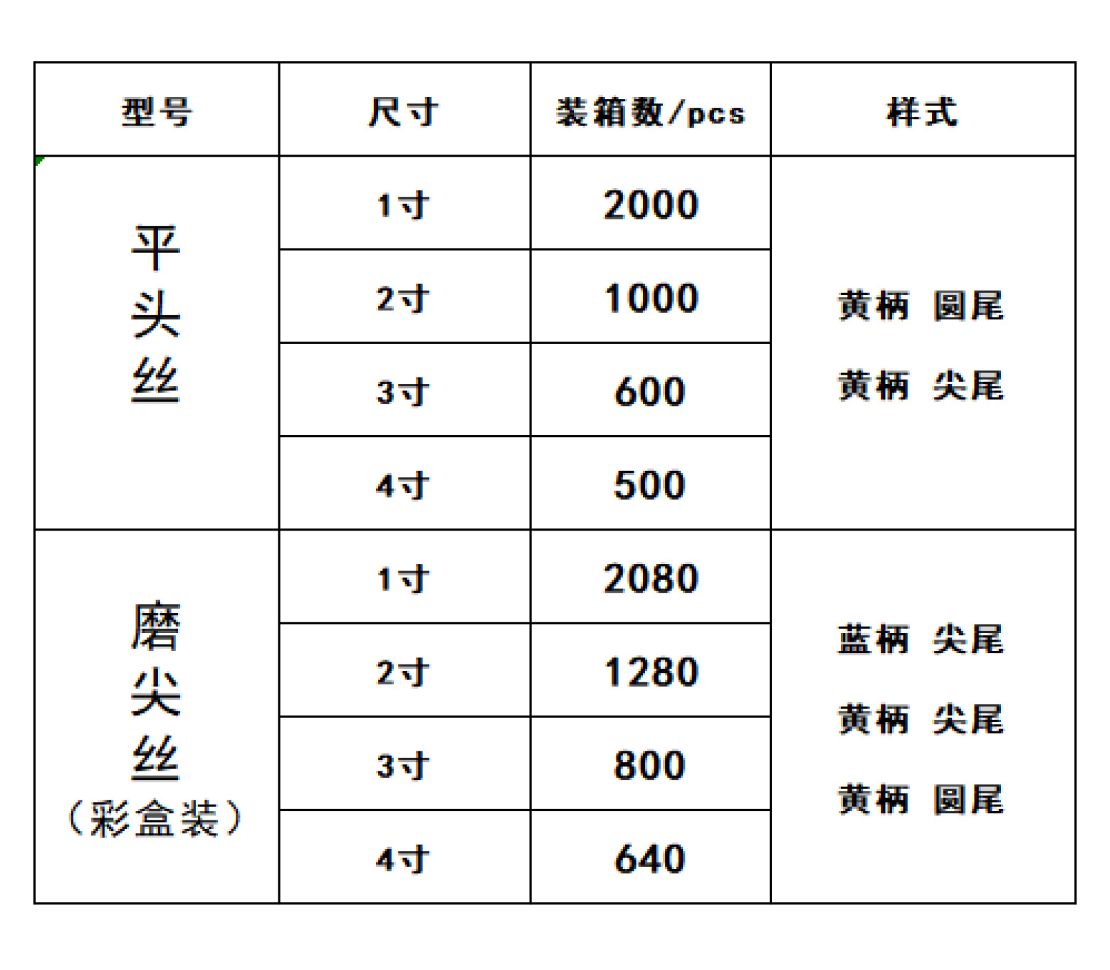 | Especificaciones y modelos | Mango amarillo; Alambre de cabeza plana de cola redonda de 1 pulgada, Mango amarillo; Alambre de cabeza plana de cola redonda de 2 pulgadas, Mango amarillo; Alambre de cabeza plana de cola redonda de 3 pulgadas, Mango amarillo; Alambre de cabeza plana de cola redonda de 4 pulgadas, Mango amarillo; Alambre de cabeza plana de cola puntiaguda de 1 pulgada, Mango amarillo; Alambre de cabeza plana de cola puntiaguda de 2 pulgadas, Mango amarillo; Alambre de cabeza plana de cola puntiaguda de 3 pulgadas, Mango amarillo; Alambre de cabeza plana de cola puntiaguda de 4 pulgadas, Mango azul; Caja de color de seda afilada de cola puntiaguda de 1 pulgada, Mango azul; Caja de color de seda afilada de cola puntiaguda de 2 pulgadas, Mango azul; Caja de color de seda afilada de cola puntiaguda de 3 pulgadas, Mango azul; Caja de color de seda afilada de cola puntiaguda de 4 pulgadas |