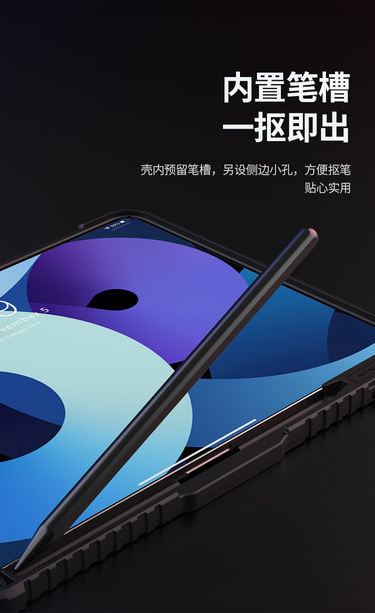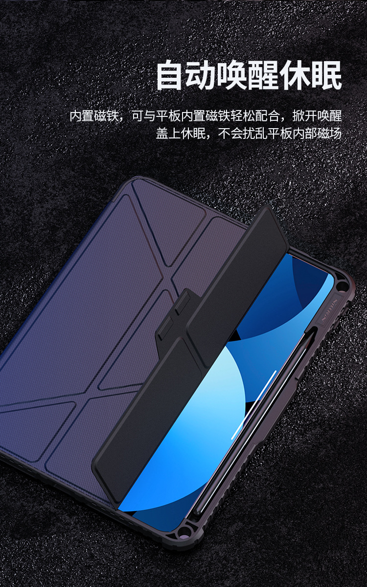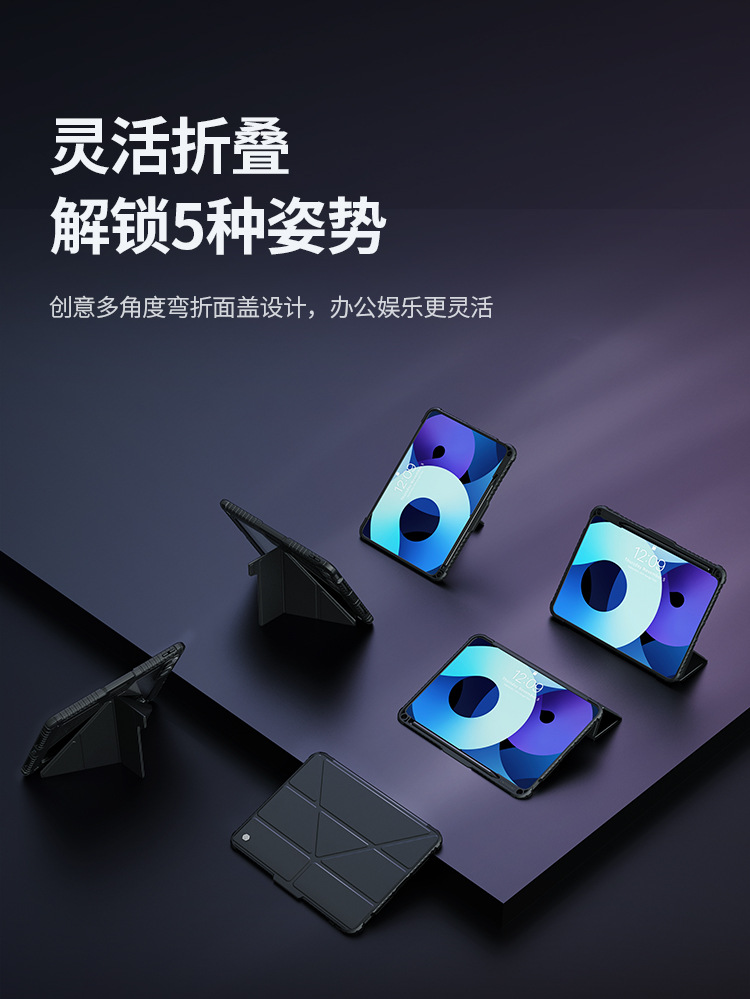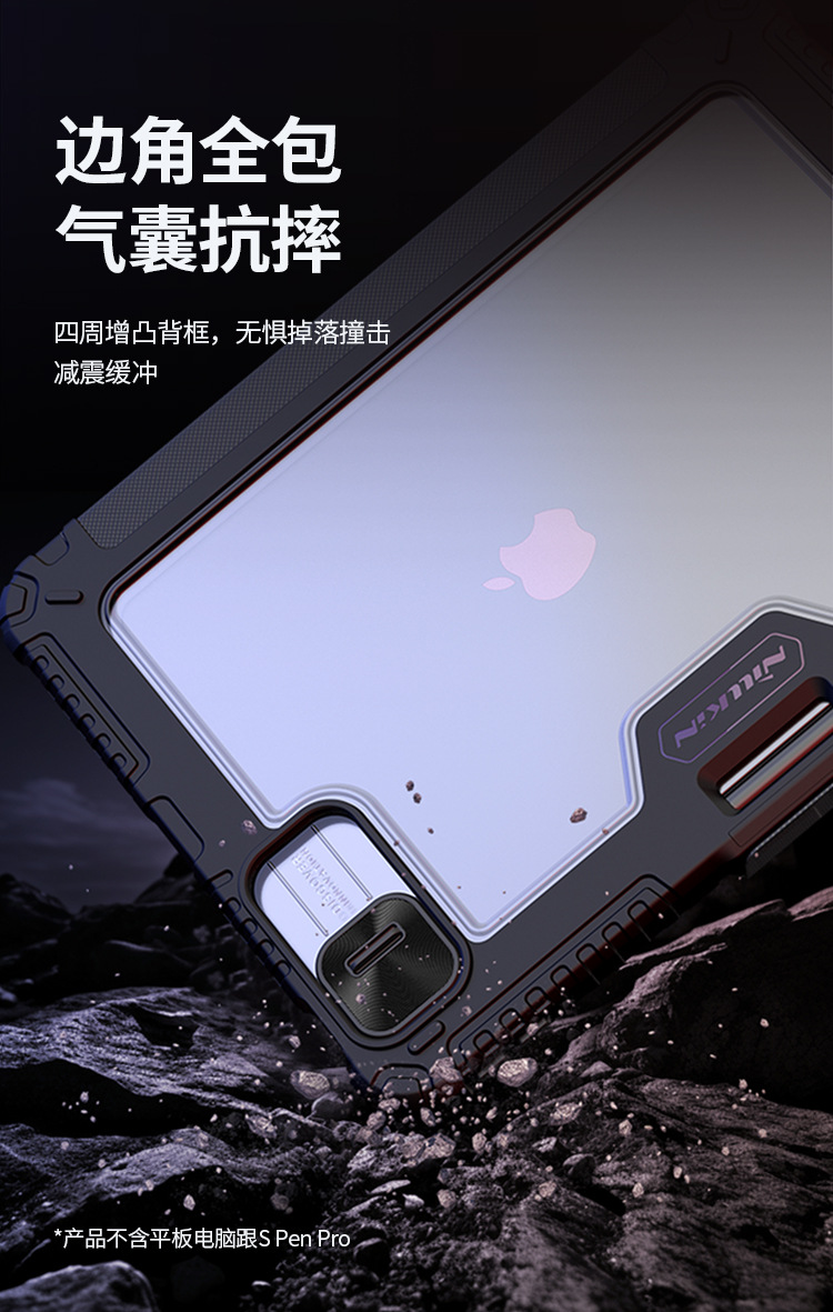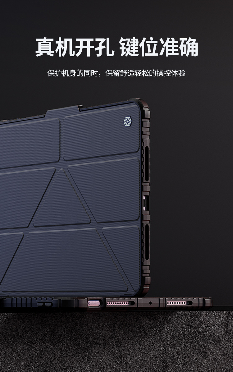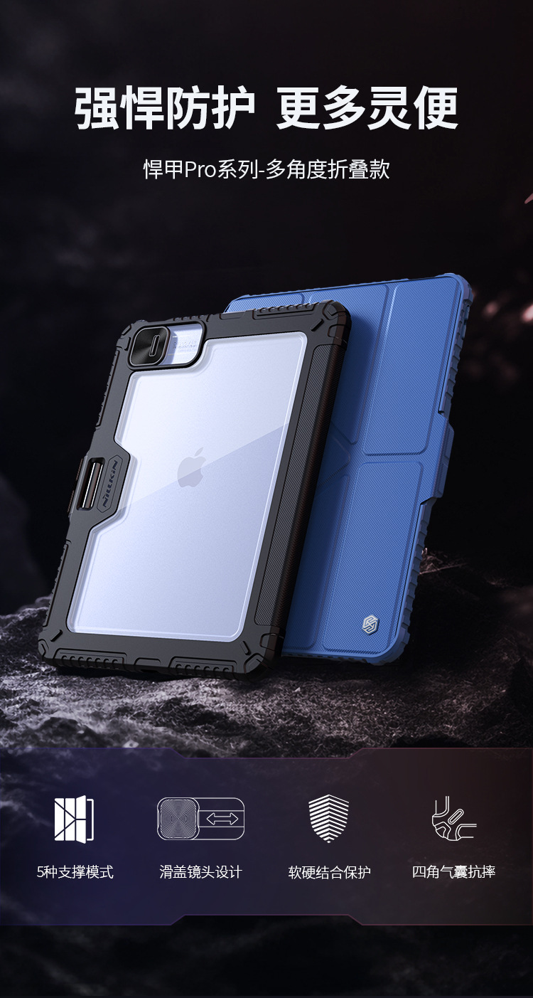 悍甲Pro系列-多角度折叠款,精选TPU+PC材质,套碑工艺一体注塑成型,软硬双重保护;增加镜头滑盖设计,保护摄像头,防刮花护隐私;面盖采用凸点晒纹PU皮革,多角度弯折设计,观屏更灵活舒适;搭扣内置磁吸,具备休眠/唤醒功能;四角气囊抗摔,四周增凸背框,无惧掉落撞击;霸气酷炫的几何造型,给人疾风劲旅的强悍气魄,凹凸有致的硬朗身形,酷似iPad的骠骑卫士,极富动感魅力,酷黑有型。传承并升华着活力、不羁、勇猛的悍之精髓。