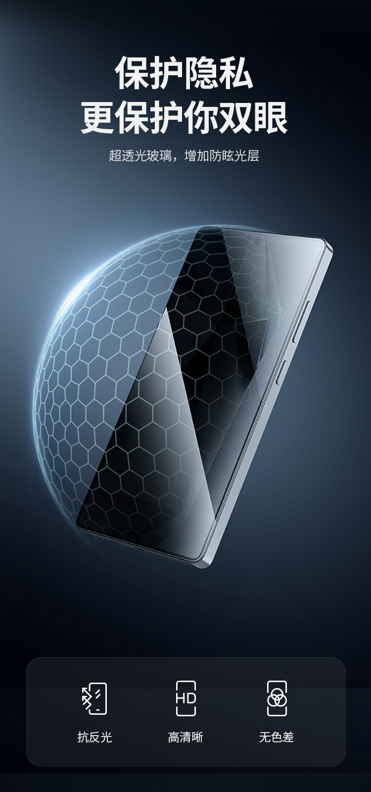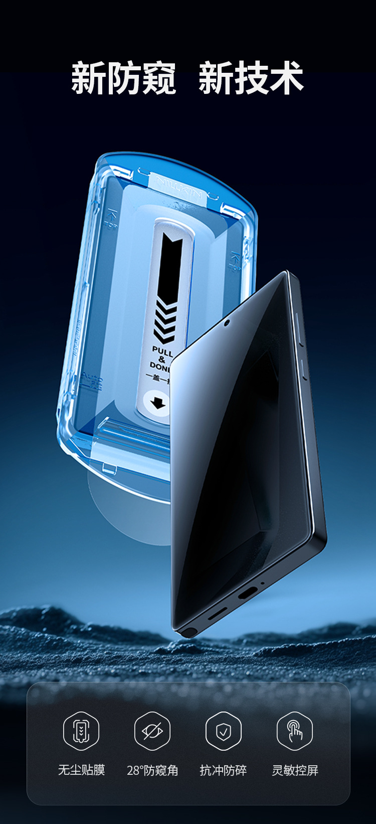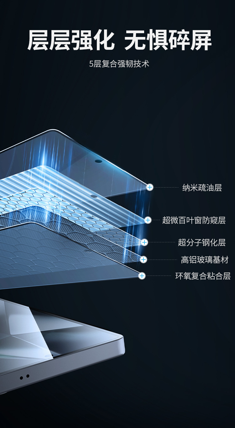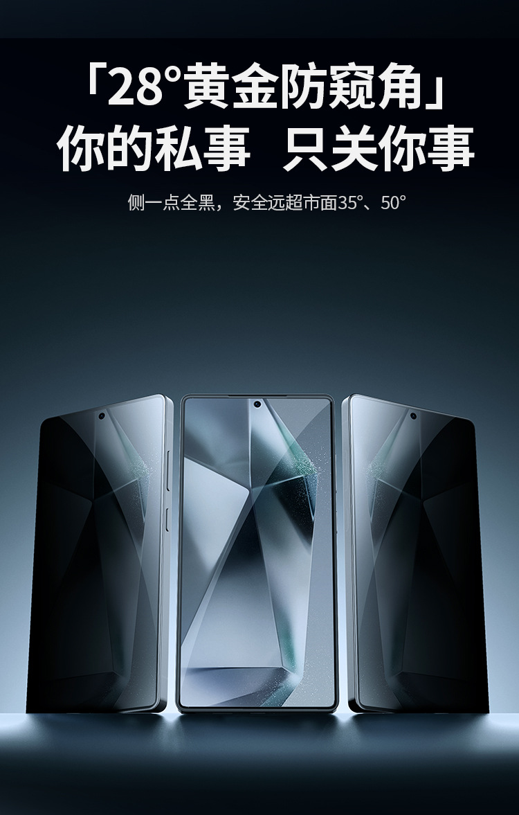隐卫钢化膜,专为保护屏幕和隐私安全而设计。配置专利无尘舱,自动定位,快速贴膜;采用28°超窄防窥技术,确保屏幕内容仅您可见,隐私保护范围更广;抗眩光涂层处理,视界清晰更护眼;二次强化高铝玻璃,抗冲击防碎边;真空电镀疏油工艺,抗油污防指纹,触感顺滑。
