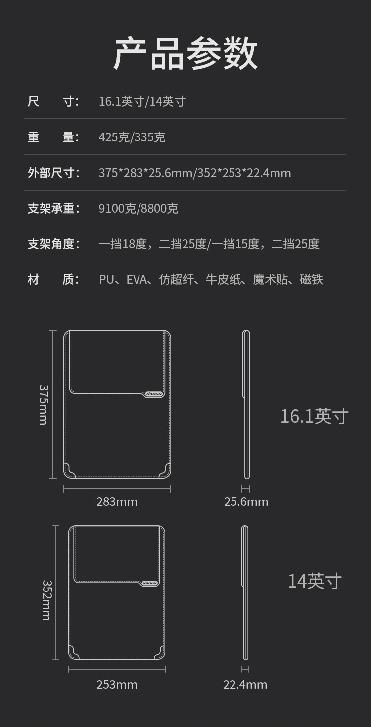 多功能用途,是收纳包,也是笔记本支架,还是鼠标垫;优选PU材质,防刮耐磨,经久耐用;内里搭载海绵绒布内里,减震防摔;配备磁吸支架,加速电脑散热,工作看屏更舒适;增加贴心魔术贴,防止使用时电脑滑落。