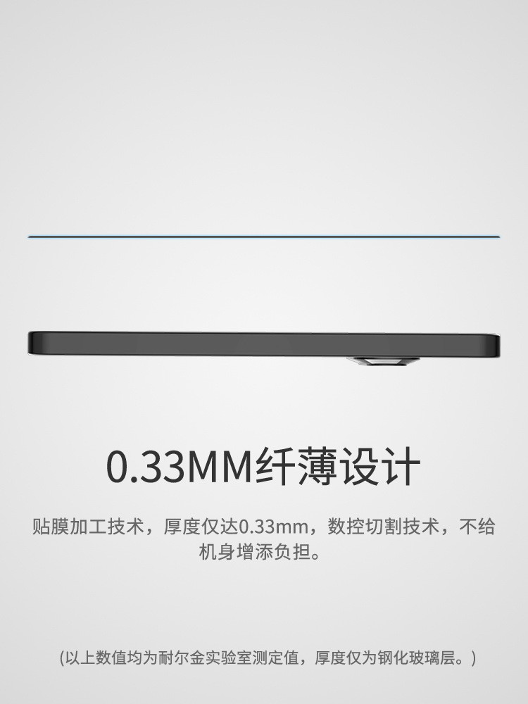 选用日本进口AGC玻璃材质,防御性能高,高透光率、高度还原屏幕原色彩。采用抗眩光涂层处理,有效防止炫光衍生。特殊钢化玻璃,硬度高达9H,耐刮花、防破碎,表面使用疏油涂层,更有效地抗油污,且可以有效阻挡、过滤紫外线。融合先进贴膜加工技术,厚度仅达0.33mm,采用数控切割技术,2.5D磨边工艺,还原屏幕触摸手感。
