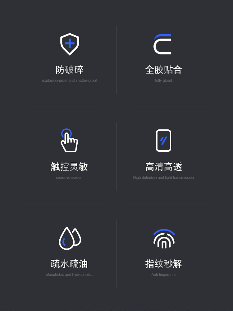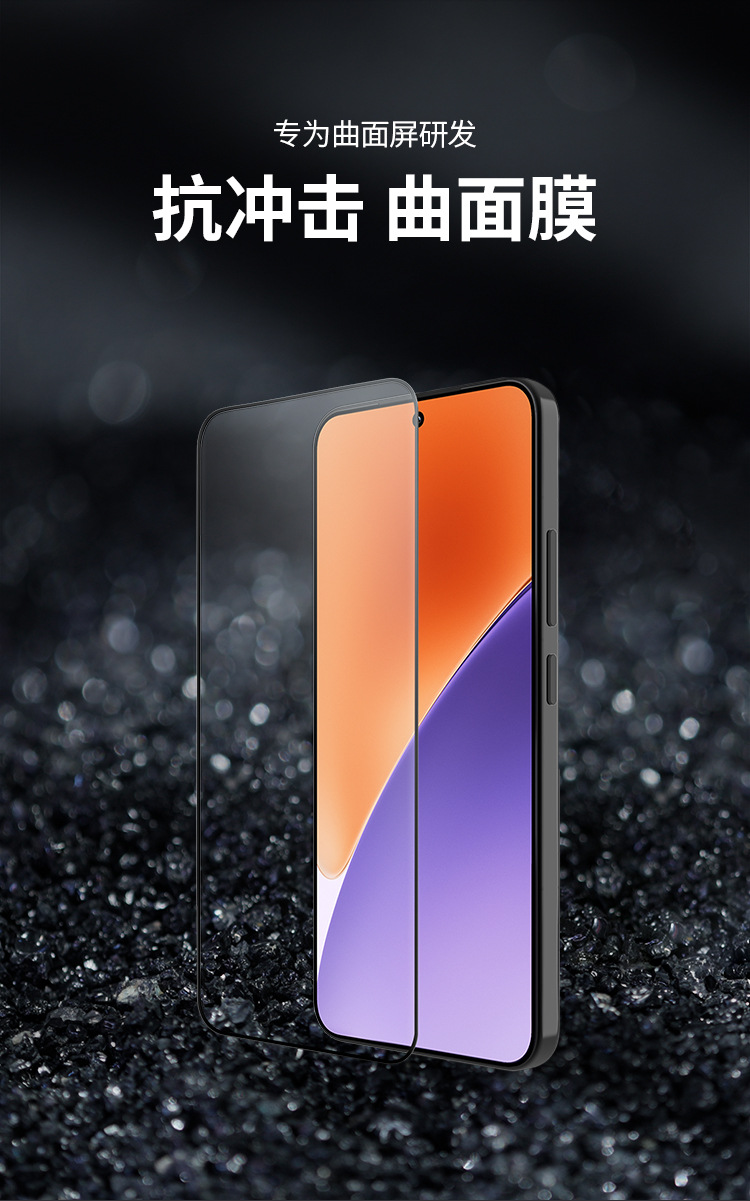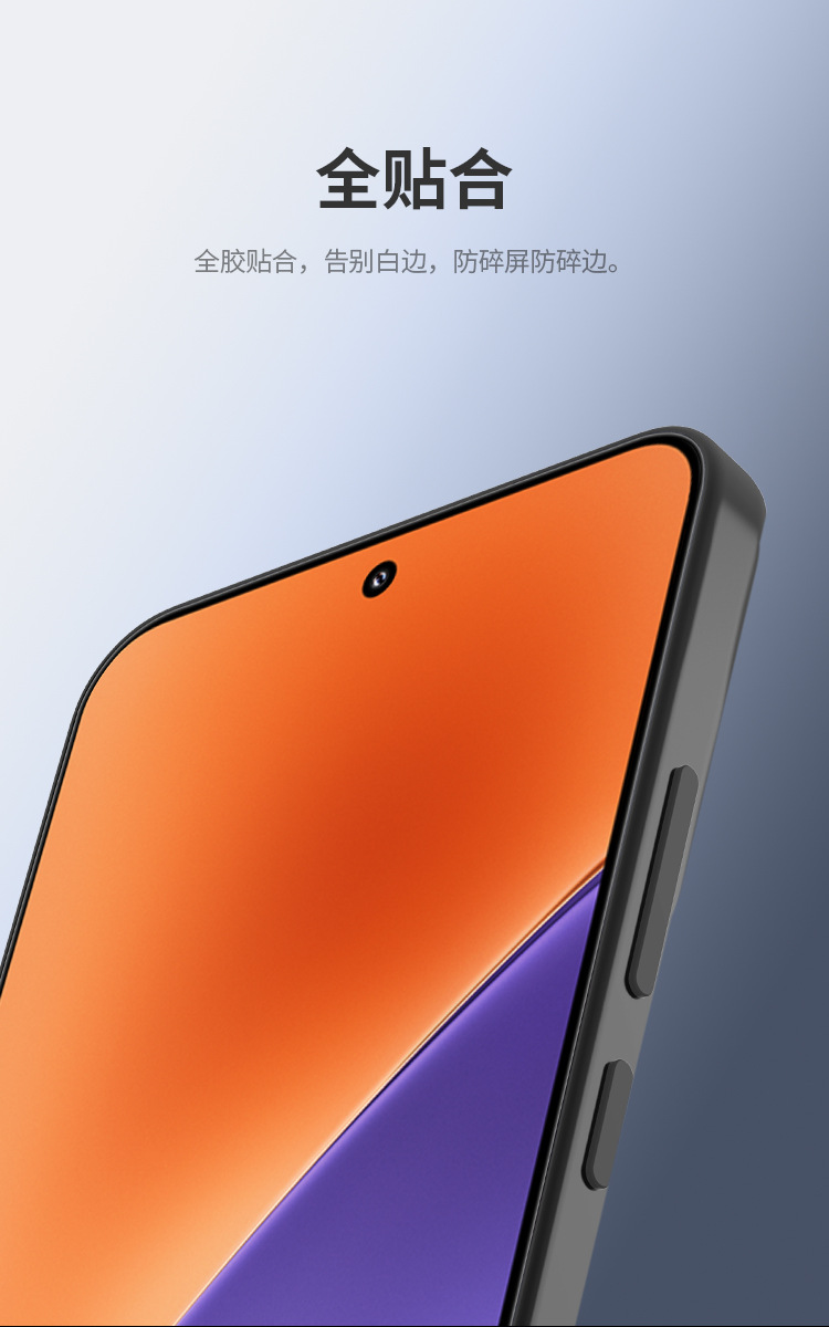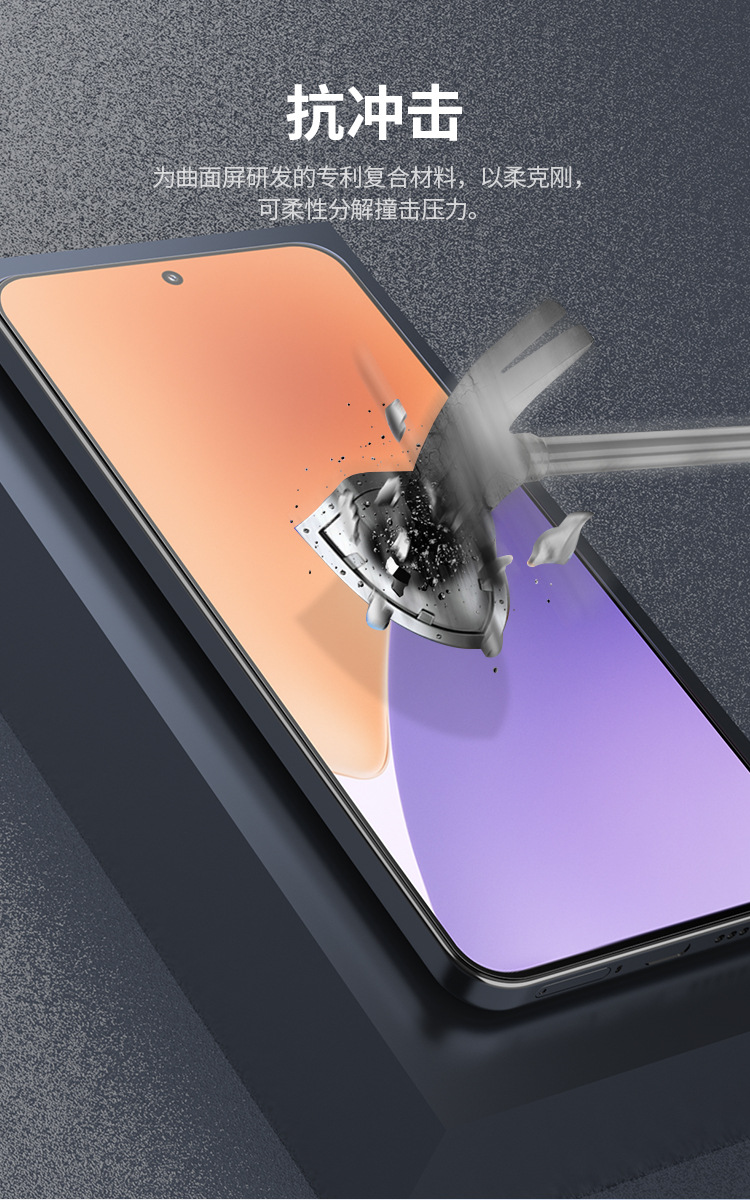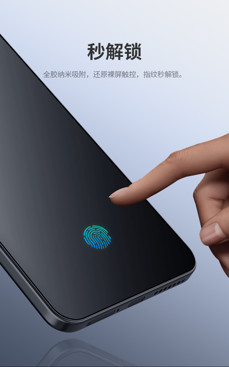优选有机玻璃专利复合材料,具有抗冲击、耐高温、高透光等优点。透光率90%以上,呈现原屏色彩;曲屏覆盖,防碎屏防碎边;全胶吸附,触控灵敏无白边,久用不变形不翘边;0.33mm轻薄,还原裸机顺滑触感,疏油疏水抗指纹;专利贴膜神器,简单易贴。