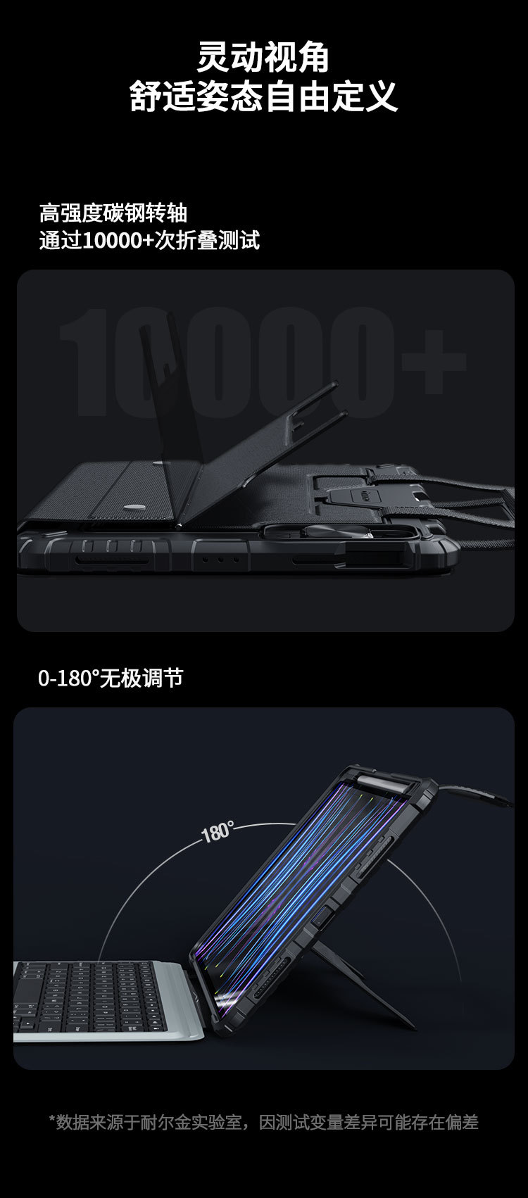 悍捷是一款专为平板打造的便携式键盘保护套,为出行、办公和娱乐都带来便利性,是移动办公的强悍搭档。磁吸手提式设计,轻松开合,出行更轻便;具有四种使用模式,无论办公或娱乐,都能找到理想的输入、观看或涂画角度;360°全包保护,搭配镜头滑盖设计,符合美国军工跌落测试标准;笔记本电脑般的键盘,助力轻松办公和创作。