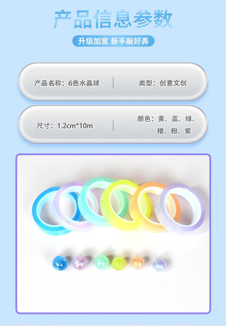 | Especificaciones y modelos | Set de 6 colores; 1.2cm de ancho * 10m de largo, un solo rollo [color al azar]; 1.2cm de ancho * 10m de largo, bolsas OPP aleatorias de 3 colores (perlas); 1.2cm de ancho * 9m de largo |
