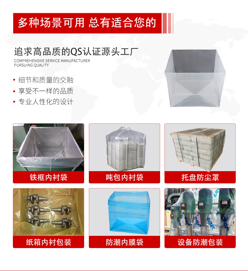 | Usos | Bolsa de película interior de PE, bolsa de protección de equipo, bolsa de fondo cuadrado de equipo mecánico, bolsa a prueba de polvo, bolsa de revestimiento interior de bolsa de tonelada, bolsa de revestimiento interior con marco de hierro de cartón, cubierta antipolvo de bandeja, bolsa cuadrada gruesa |
