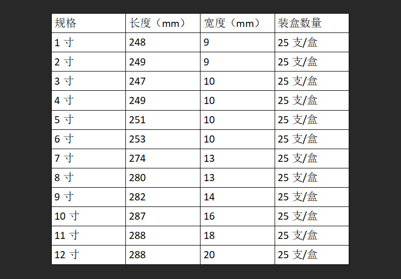 | modelo | No. 1, 25 piezas por caja,No. 2, 25 piezas por caja,No. 3, 25 piezas por caja,No. 4, 25 piezas por caja,No. 5, 25 piezas por caja,No. 6, 25 piezas por caja,No. 7, 25 piezas por caja,No. 8, 25 piezas por caja,No. 9, 25 piezas por caja,No. 10, 25 piezas por caja,No. 11, 25 piezas por caja,No. 12, 25 piezas por caja,Juego de pinceles |