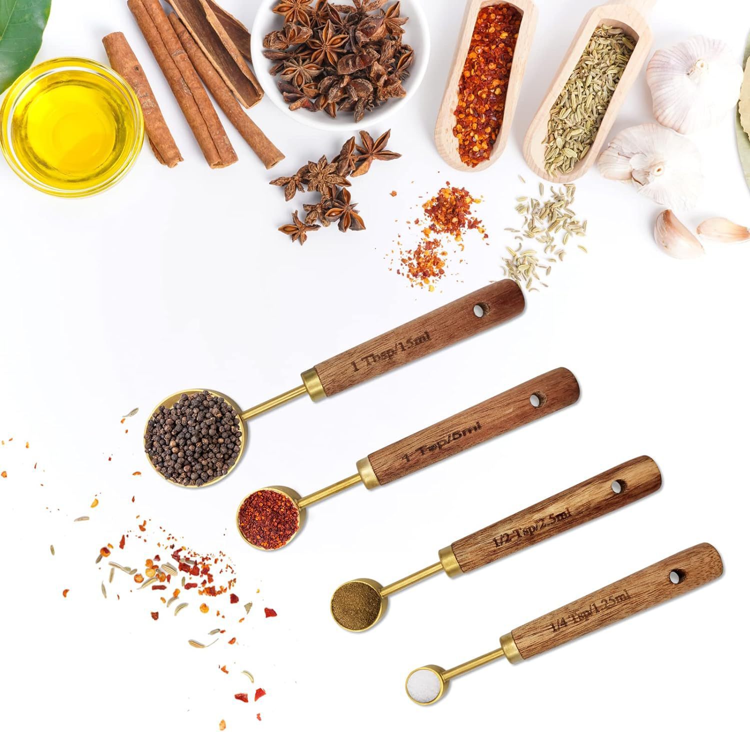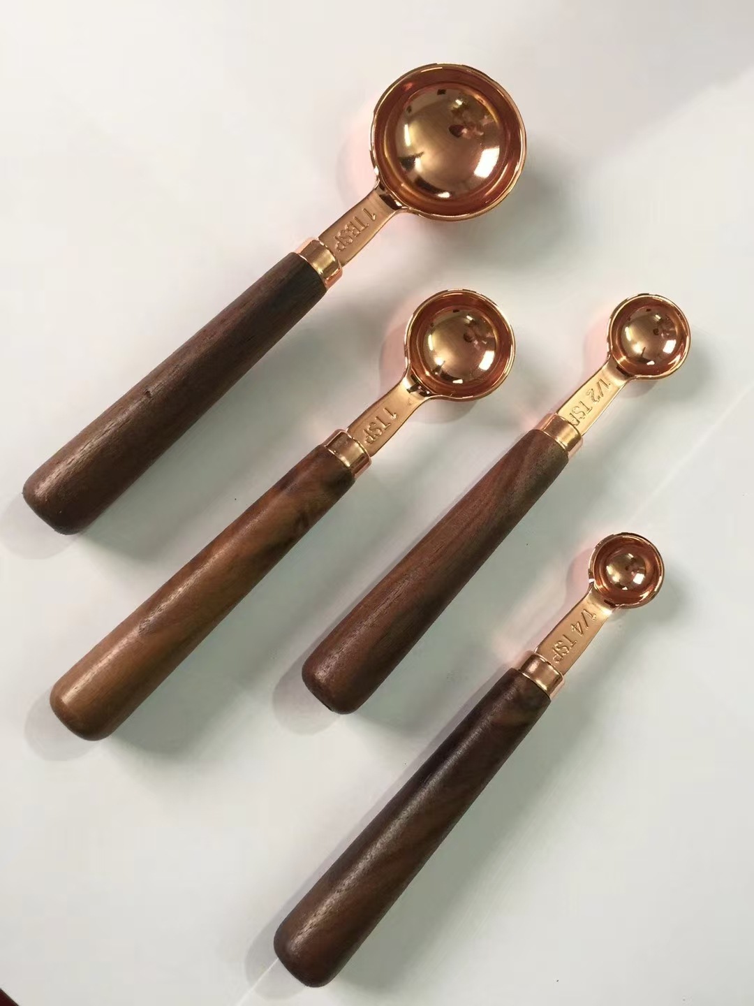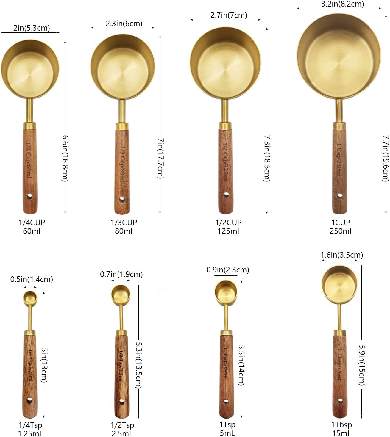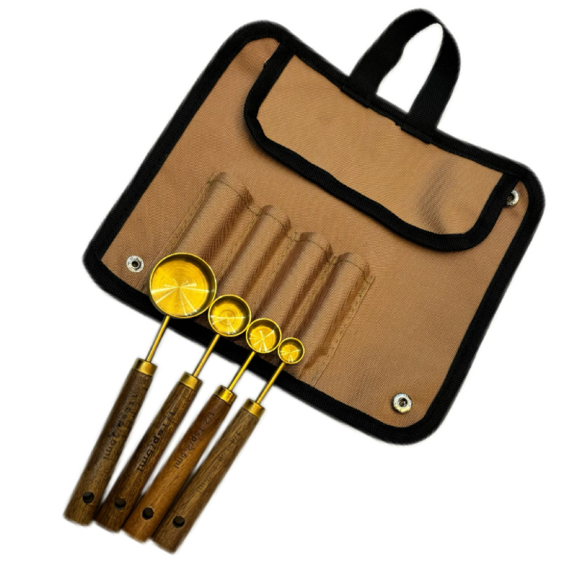 | Especificaciones | Cuchara de medición de taza de mango de madera dorada, juego de cuatro tazas de medición de mango de madera dorada |