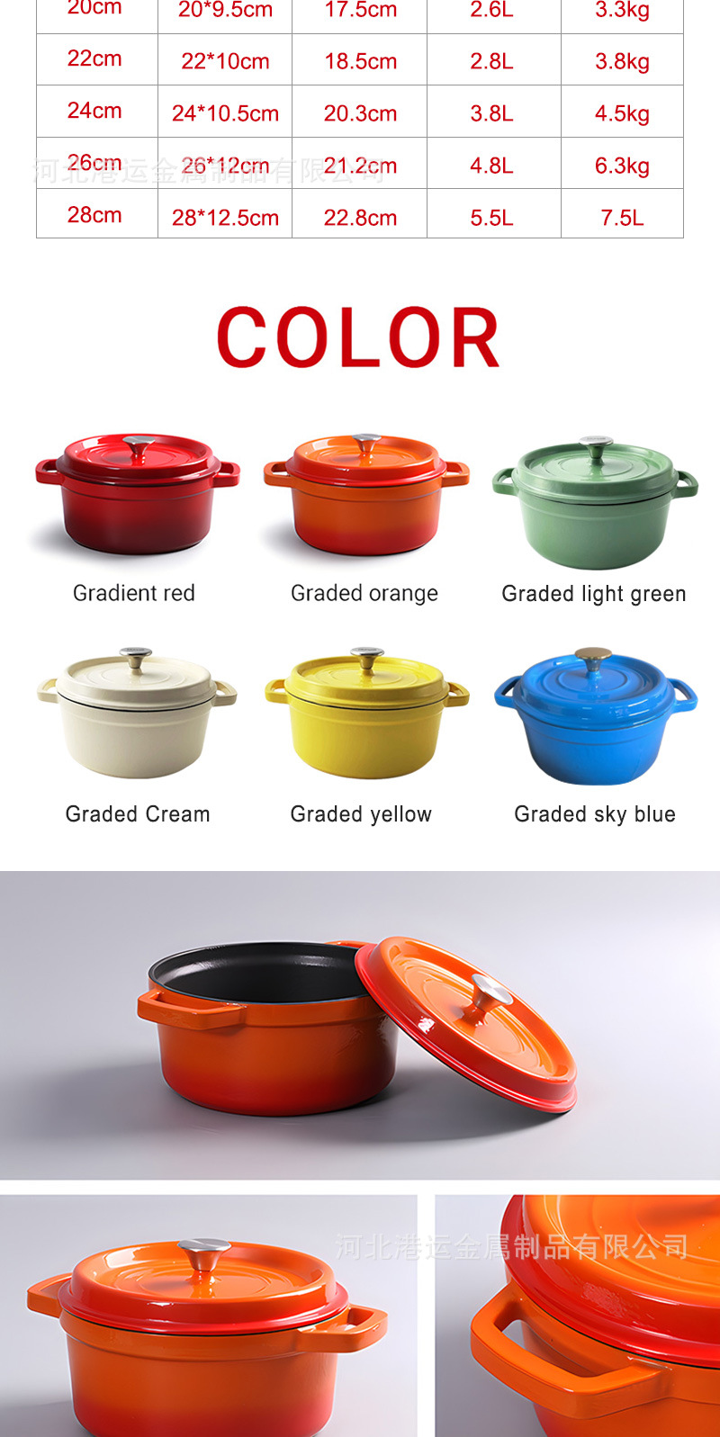 | Especificaciones | 20cm olla de esmalte 20cm Cast iron enamel pot,22cm olla de esmalte 22cm Cast iron enamel pot,Olla de esmalte de 24cm | tamaño de venta caliente 24cm Cast iron enamel pot,26cm olla de esmalte 26cm Cast iron enamel pot,Olla de hierro fundido esmaltado de 28 cm. |