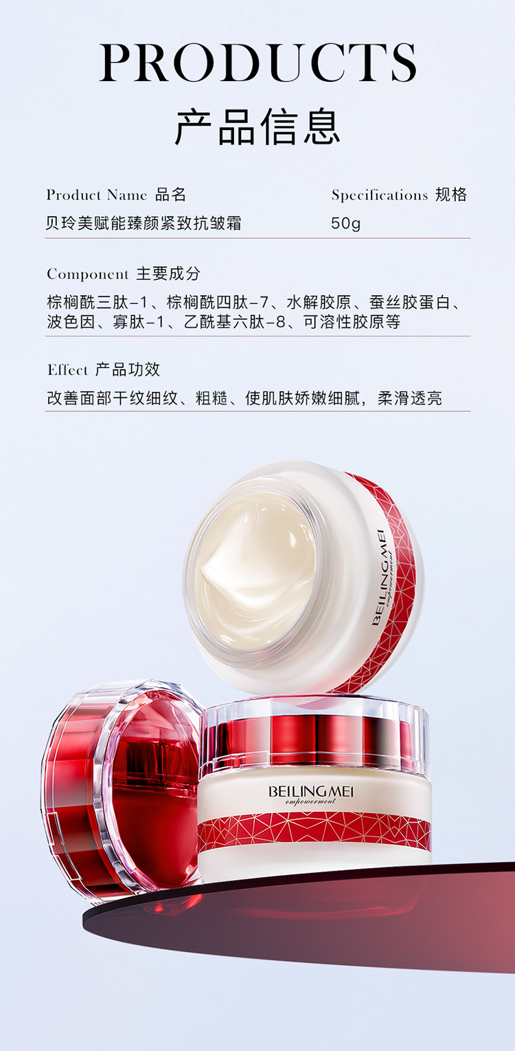 | Especificaciones del producto | Beilingmei empodera la cara y aprieta la crema anti - arrugas 50g |