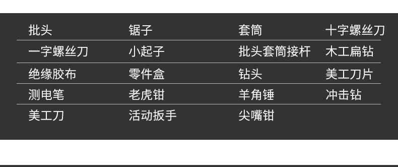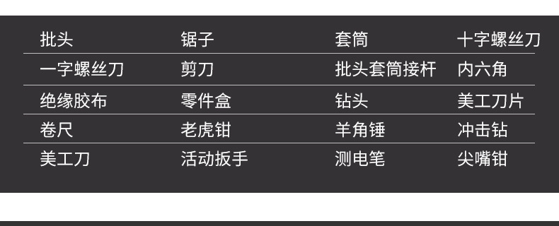 | Modelo | Juego de herramientas 48 (1), juego de herramientas 108, juego de herramientas 52, juego de herramientas 49, juego de herramientas 46 (1), juego de herramientas 46 (2), juego de herramientas 48 (2) |