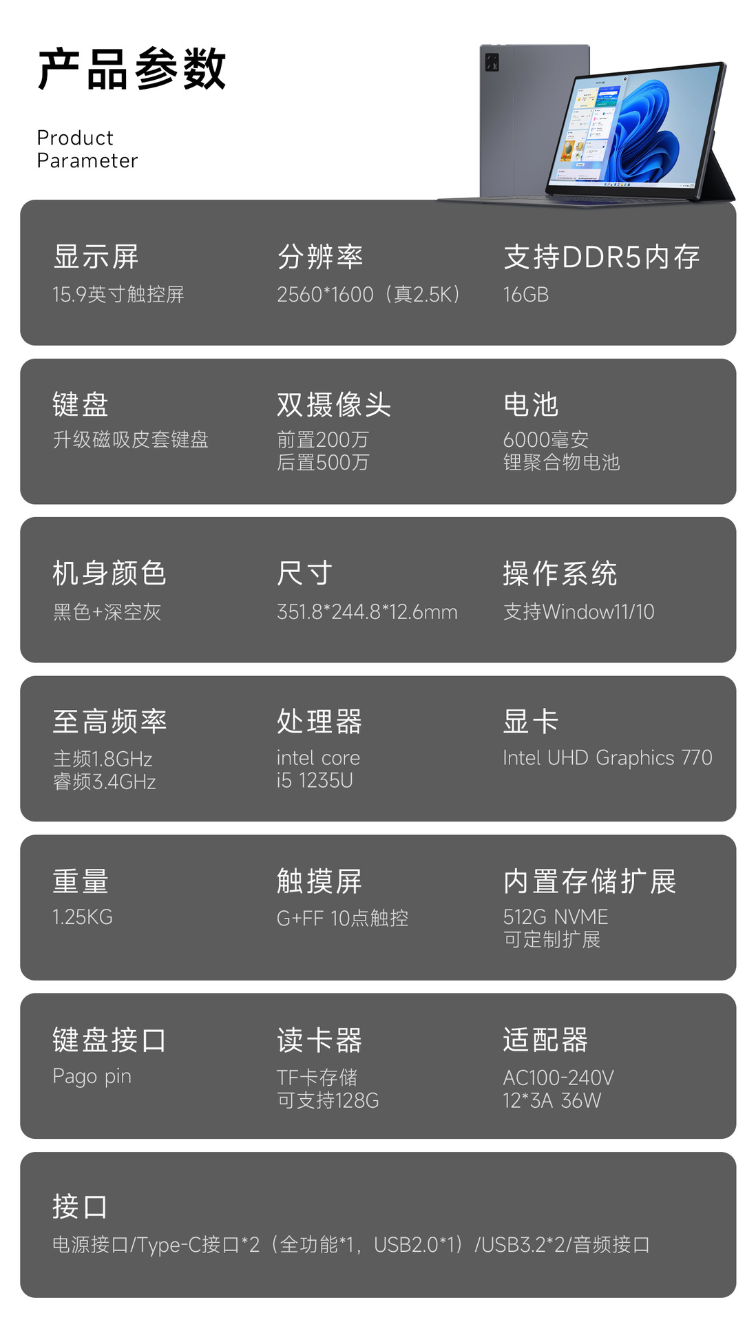| Color | 10,1 pulgadas / n5030 / 8g + 128g - ssd, 10,95 pulgadas / 6500y / 12g + 256g - ssd, 11,97 pulgadas / 6500y / 12g + 256g - ssd, 13 pulgadas / n100 / 12g + 512g - nvme, 15,9 pulgadas / n100 / 16g + 512g - nvme, 15,9 pulgadas i5 - 1235u / 32g + 512g - nvme |