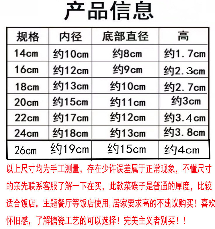| Color | El diámetro de la boca del disco de tratamiento de porcelana es de 14 centímetros de la tabla de detalles de referencia del tamaño del plato de borde rojo, el diámetro de la boca del disco de tratamiento de porcelana es de 16 centímetros de la tabla de detalles de referencia del tamaño del plato de borde rojo, el diámetro de la boca del disco de tratamiento de porcelana es de 18 centímetros de la tabla de detalles de referencia del tamaño del plato de borde rojo, el diámetro de la boca del disco de tratamiento de porcelana es de 20 centímetros de la tabla de detalles de referencia del tamaño del plato de borde rojo, el diámetro de la boca del disco de tratamiento de porcelana es de 22 centímetros de la tabla de detalles de referencia del tamaño del plato de borde rojo, el diámetro de la boca del disco de tratamiento de porcelana es de 26 centímetros de la tabla de detalles de referencia del plato de borde rojo, el tamaño del plato de procesamiento de porcelana es de 30 centímetros de la hoja de referencia aleatoria, 30 centímetros de tratamiento de pérdida de porcelana 30 cm bandeja de té rojo, azul, verde y tricolor al azar, tratamiento de pérdida de porcelana 32 cm bandeja de Té negro en forma de flor al azar, tratamiento de pérdida de porcelana 36 cm citas nostálgicas al azar, tratamiento de pérdida de porcelana 36 cm Los tres colores de la bandeja de té son aleatorios, los tres colores de la bandeja de té de 40 cm son aleatorios, los tres colores de la bandeja de té de 45 cm son aleatorios, los tres colores de la bandeja de té de 50 cm son aleatorios, los tres colores de la bandeja de Té negro de 30 cm son aleatorios, los tres colores de la bandeja de Té negro de 30 cm son aleatorios, los tres colores de la bandeja de Té negro de 35 cm son aleatorios, los tres colores de la bandeja de Té negro de 36 cm son aleatorios, los cuatro colores de la bandeja de Té negro de 40 cm son aleatorios, los cuatro colores de la bandeja de Té negro de 45 cm son aleatorios, los 50 cm son aleatorios. |