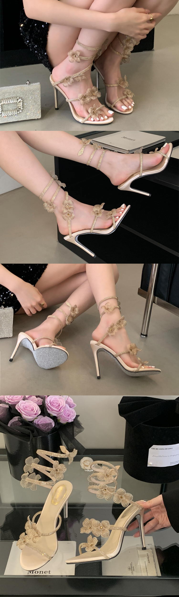 Flores de diamante serpente con sandalias de talón alto, cabeza redonda, dedos abiertos, sandalias romanas de talón grande