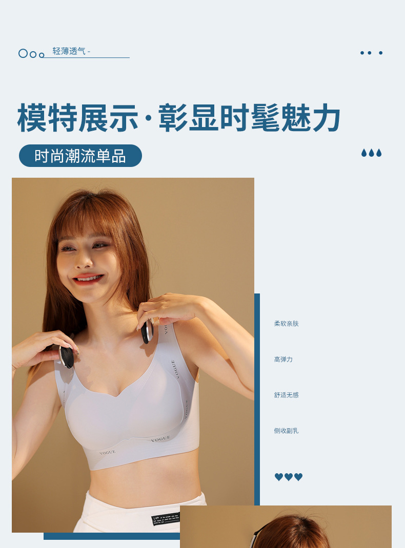 | Función | Cohesión, sin marcas, transpirabilidad, soporte superior, absorción de sudor, protección contra la luz diurna, tipo de ajuste, cómodo, recogida lateral, recogida de leche no esencial, pecho grande y pequeño |