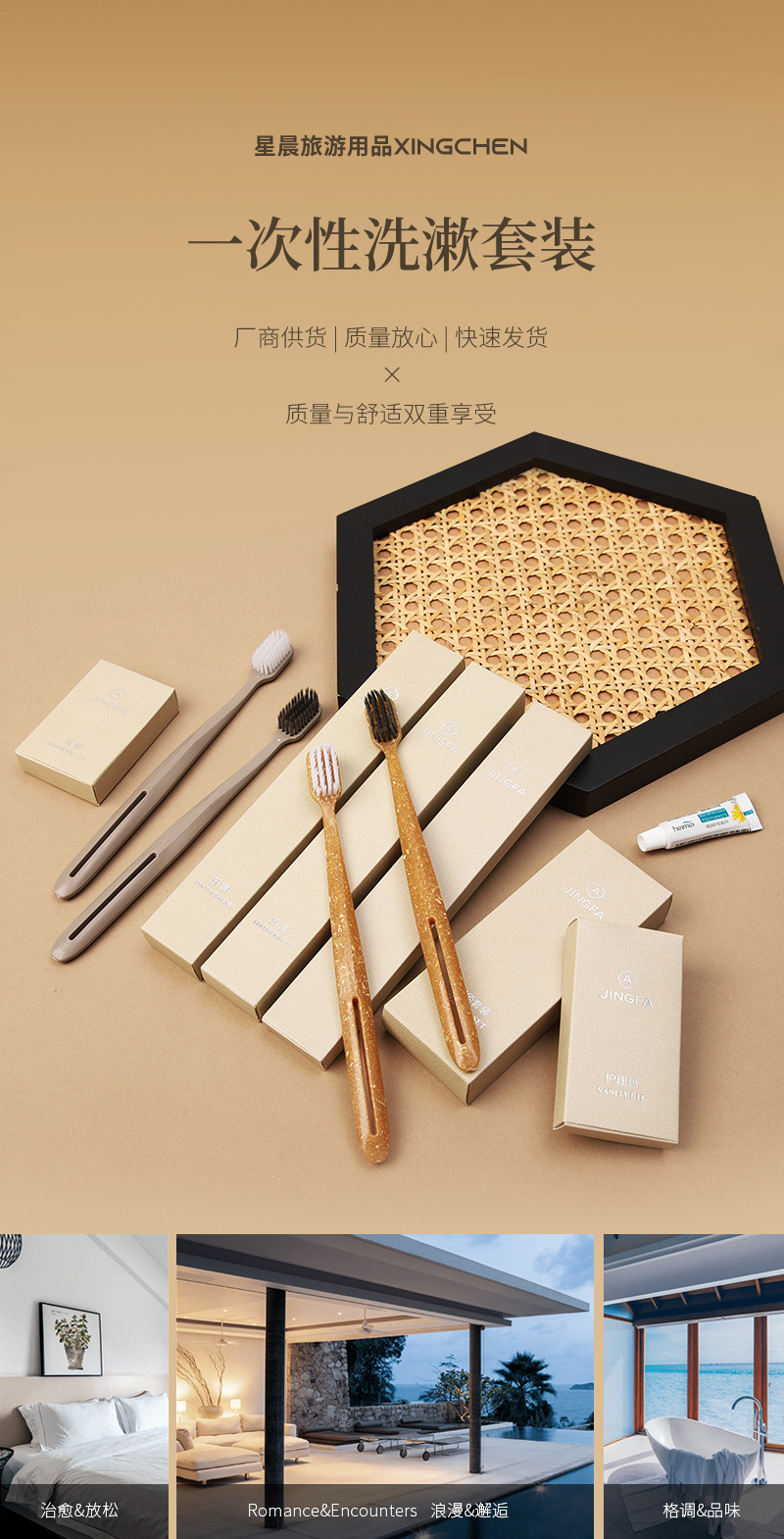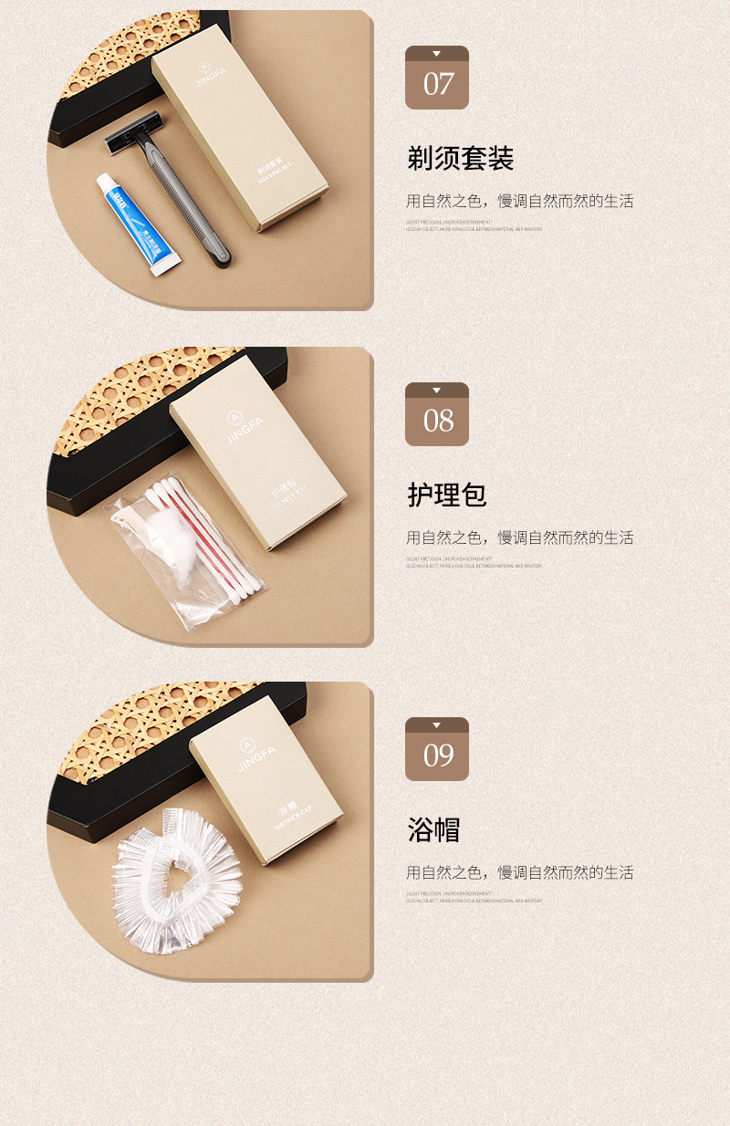 | Conjunto de productos | Hisopos de algodón, bolsos de aguja, gorras de baño desechables, afeitadoras desechables, cepillos de dientes desechables, peines desechables, pasta de dientes desechable, crema de afeitar desechable |