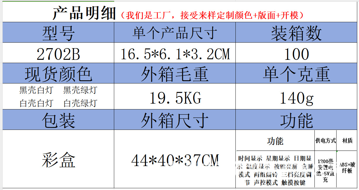 | Características especiales | Luminoso,Espejo,Pronóstico del tiempo,Calendario,Alarma,Calendario,Indicación de 24 horas,Medición de la humedad,Pantalla de energía,Exhibición de la semana |