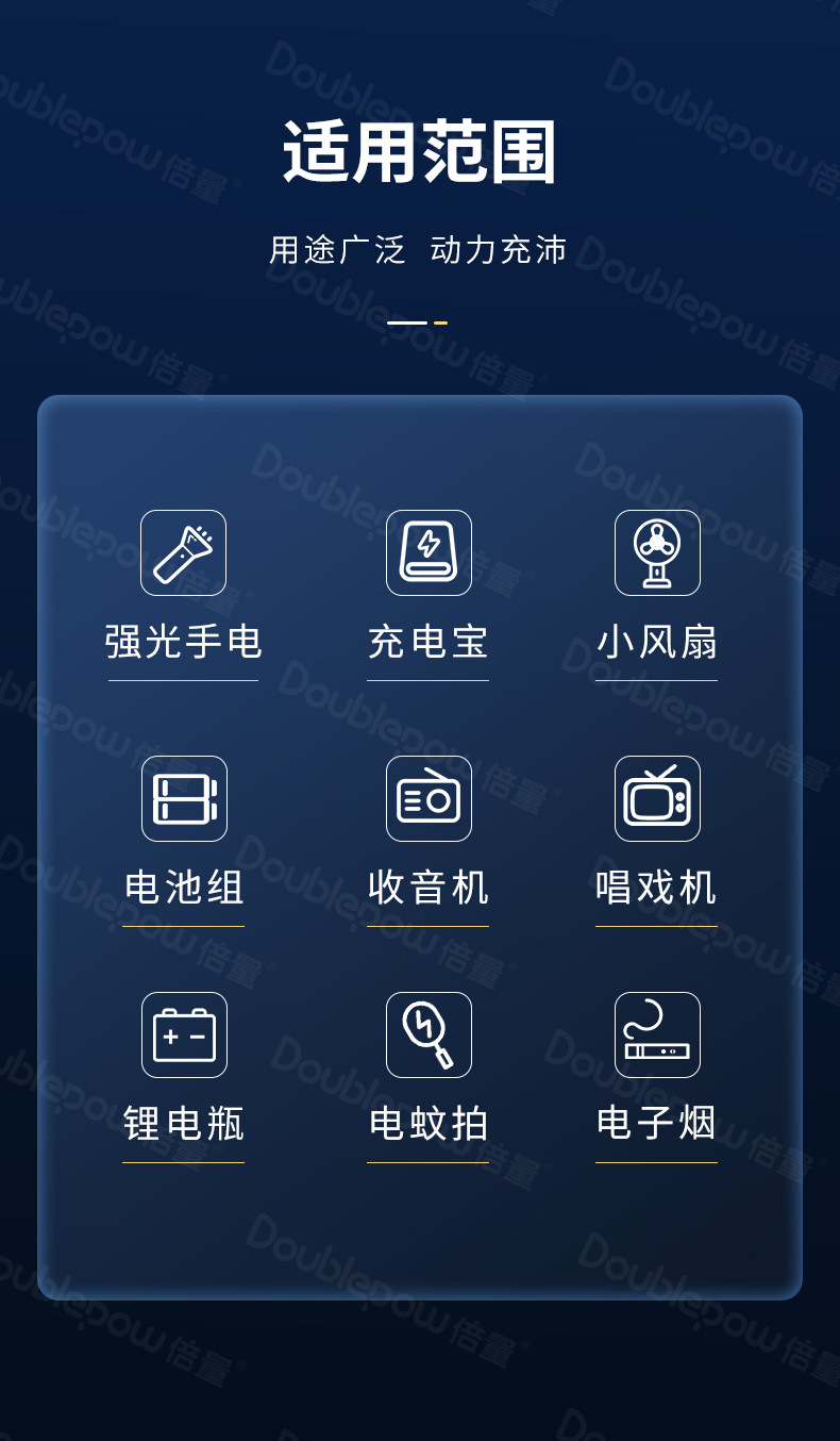 | Tipos aplicables | Cámara, intercomunicador, libro electrónico, auriculares bluetooth, grabadora de video, altavoz portátil, marco digital, lápiz de grabación, fuente de alimentación, consola de juegos, teléfono inalámbrico, navegador electrónico, proyector portátil, reproductor MP3 / MP4, dispositivo portátil, gafas VR, fuente de alimentación portátil de almacenamiento de energía |