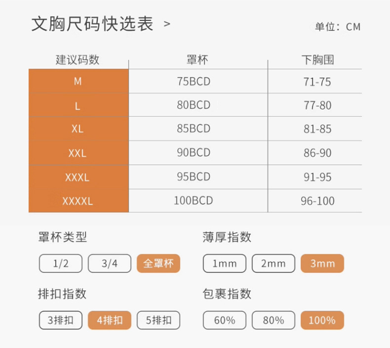 | Talla | M-34/75BCD,L-36/80BCD,XL-38/85BCD,2XL-40/90BCD,3XL-42/95BCD,4XL-44/100BCD |