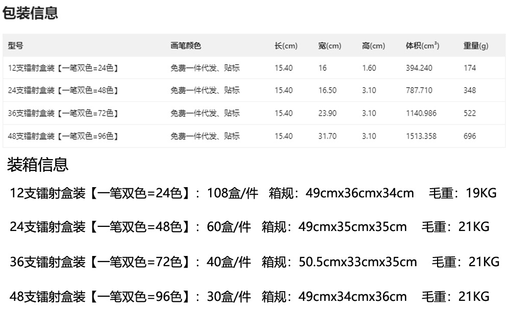 | Modelo | 12 cajas de láser [un doble color = 24 colores], 24 cajas de láser [un doble color = 48 colores], 36 cajas de láser [un doble color = 72 colores], 48 cajas de láser [un doble color = 96 colores] |