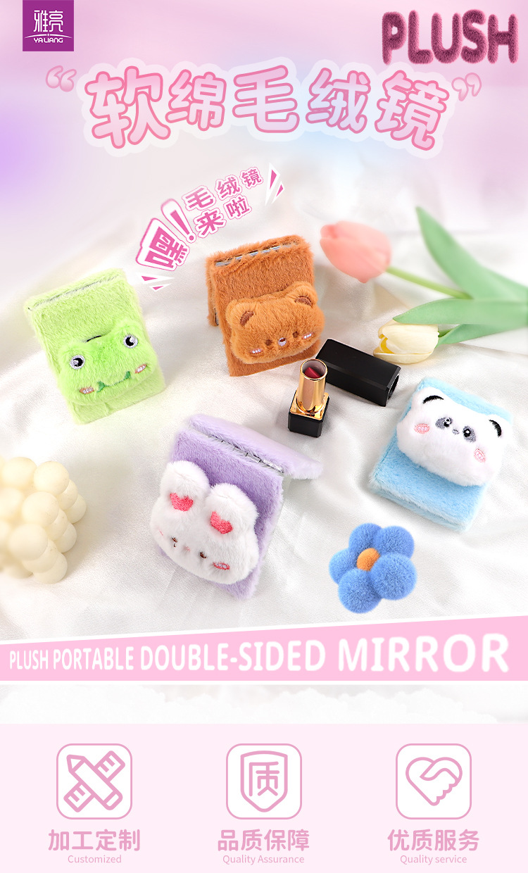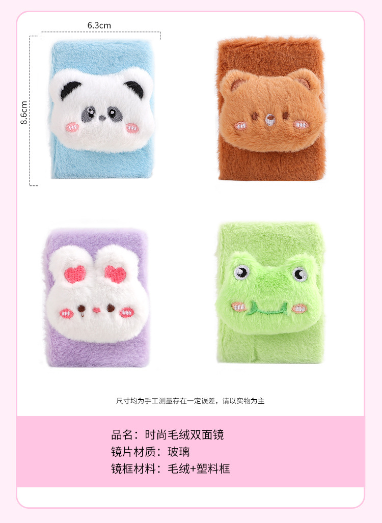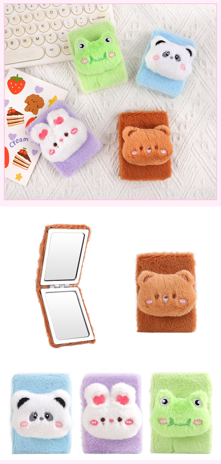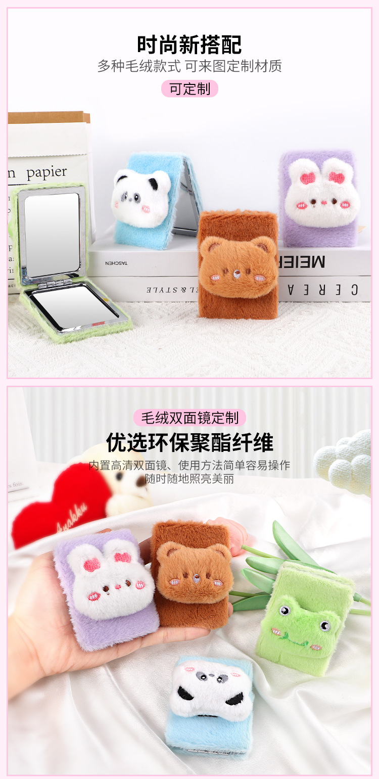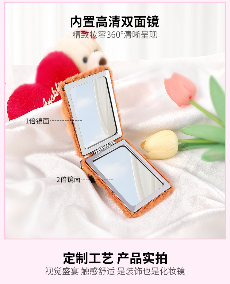 Nuevos aditivos de peluche rectangular plegable espejo de maquillaje logotipo personalizado pequeño regalo plegable espejo de bolso llavero cuerda de mano