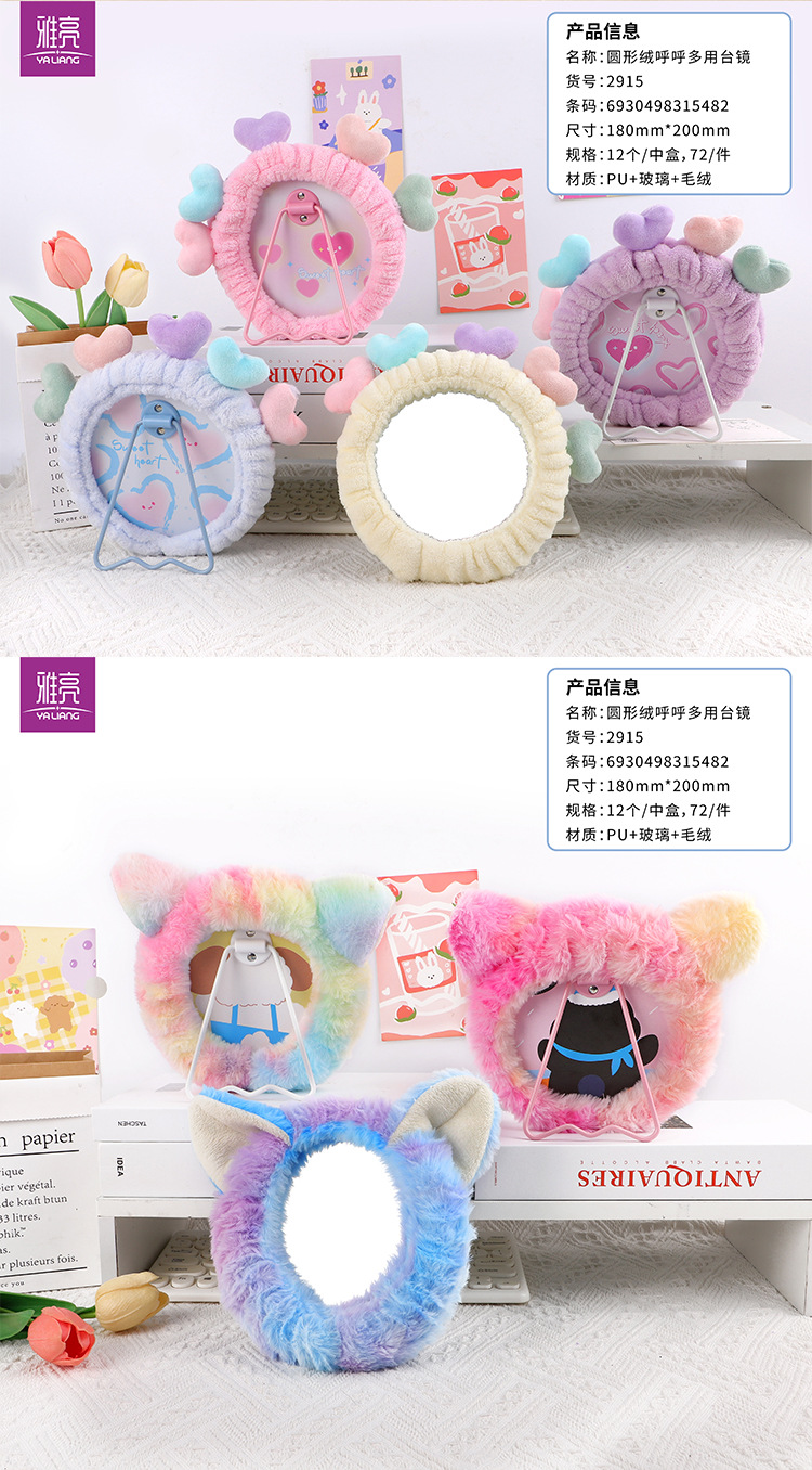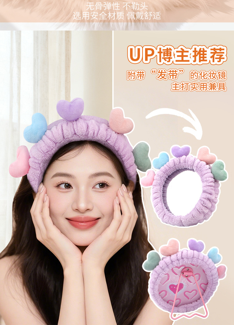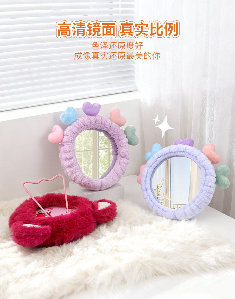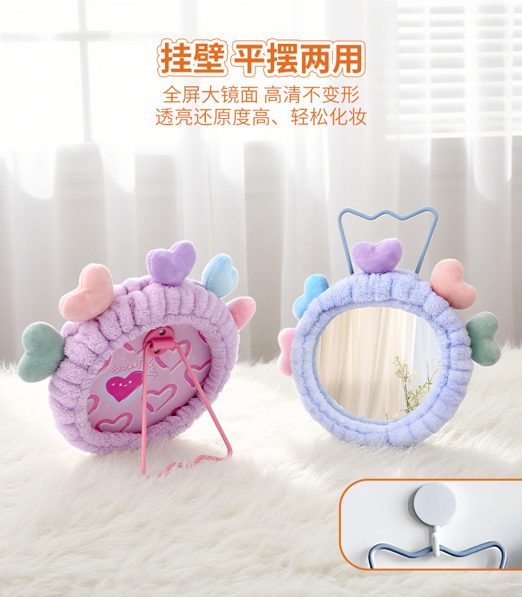 Espejo de mesa de soporte de cuero impreso redondo y correa de pelo de lavado de cara para mujeres coreanas lindas en línea amor bandana de cabeza de baño colgando espejo