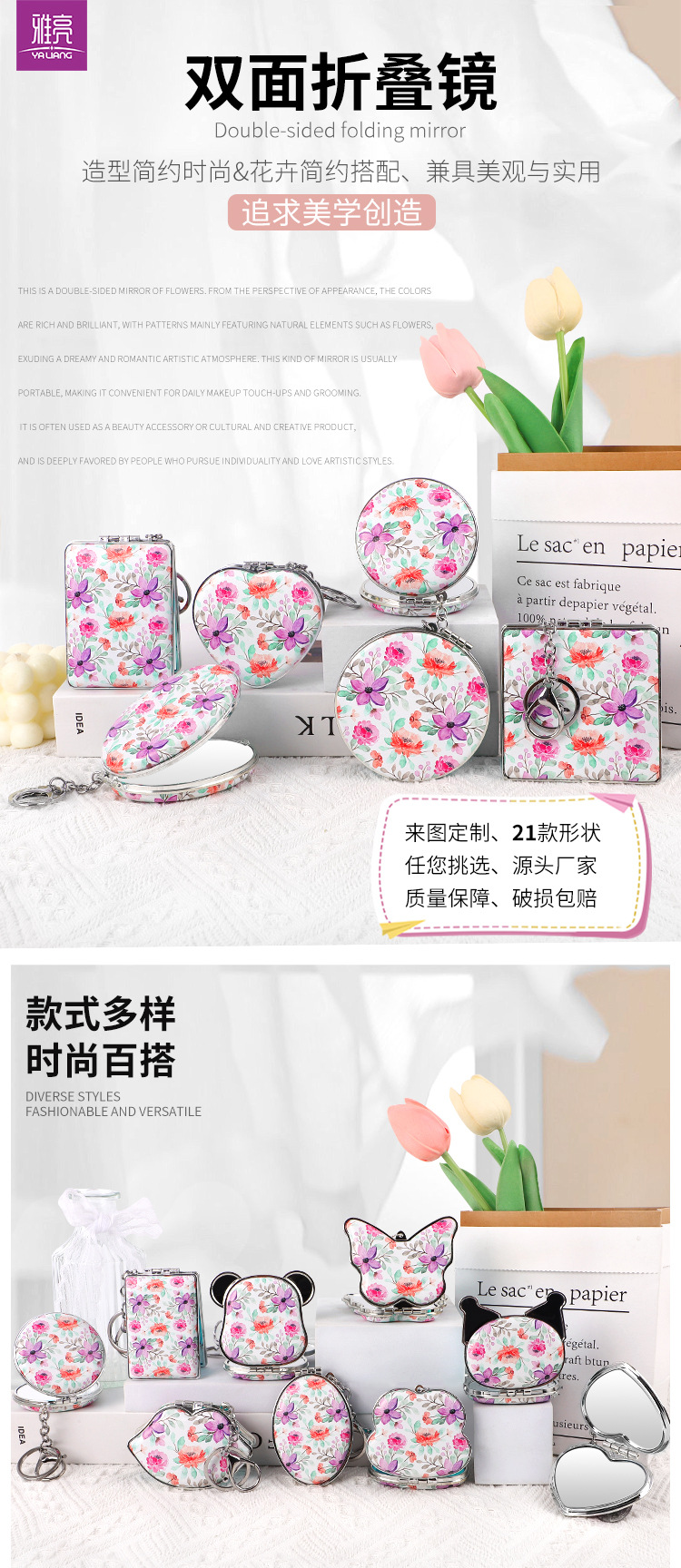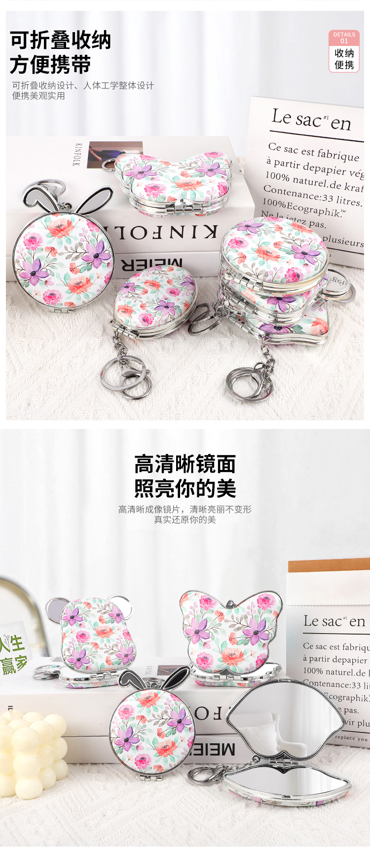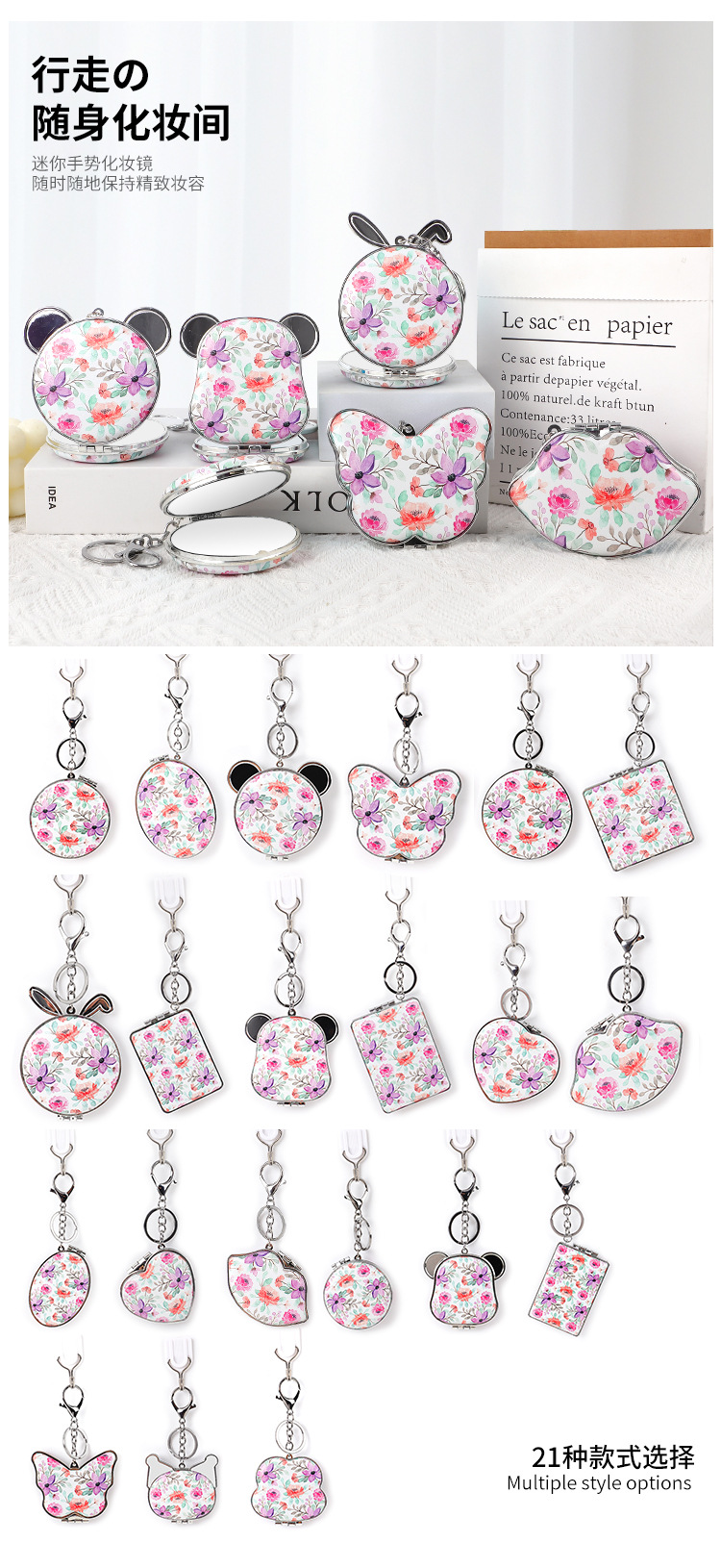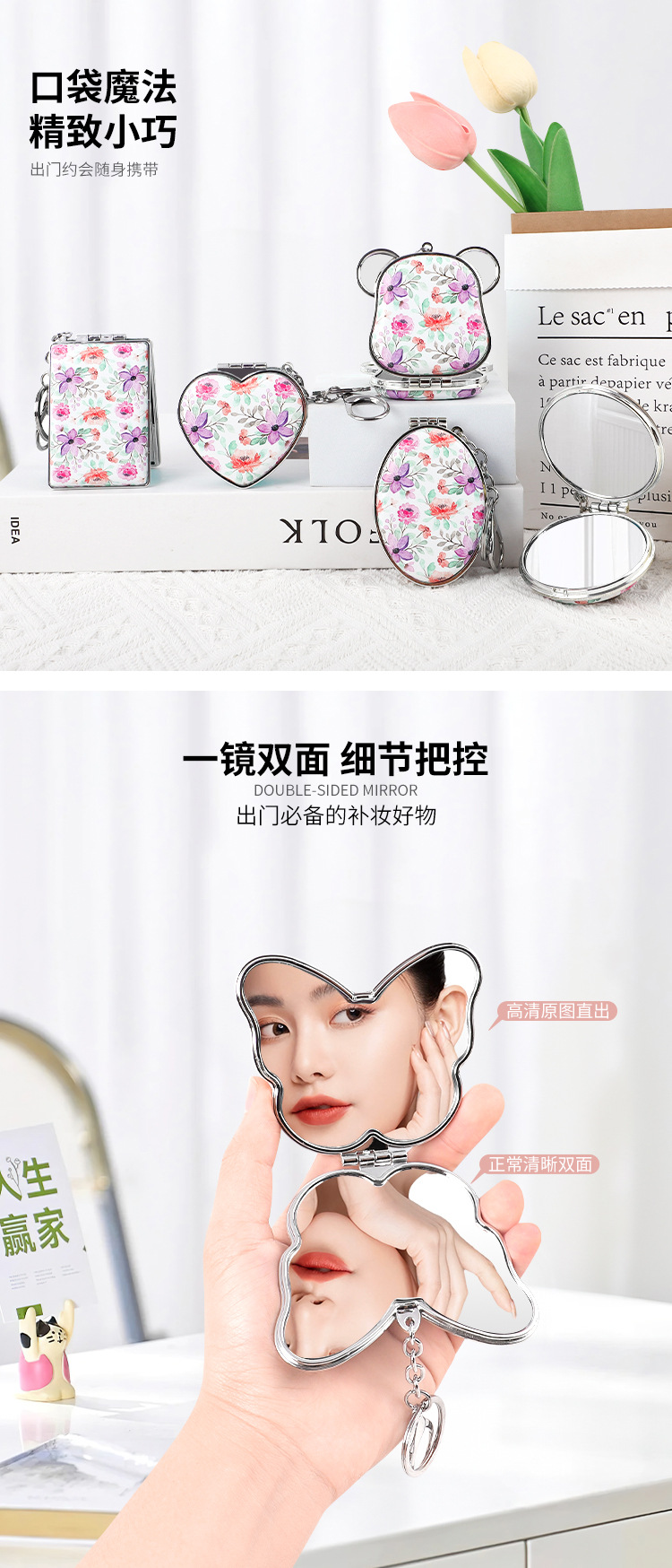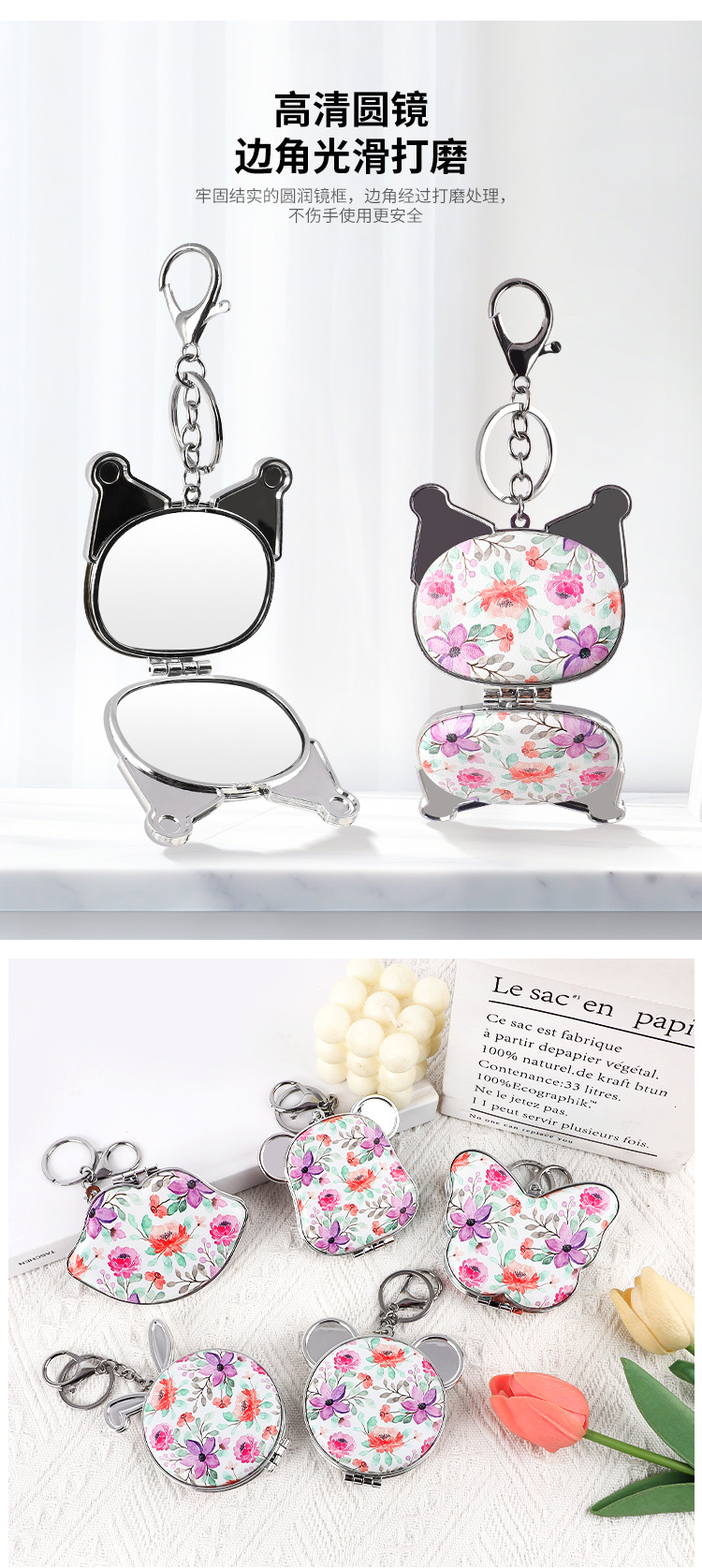 Suministro directo de fábrica de una variedad de formas, bolsa colgante, espejo de princesa, espejo de cuero de impresión de doble cara, espejo plegable, bolsa colgante, llavero de espejo