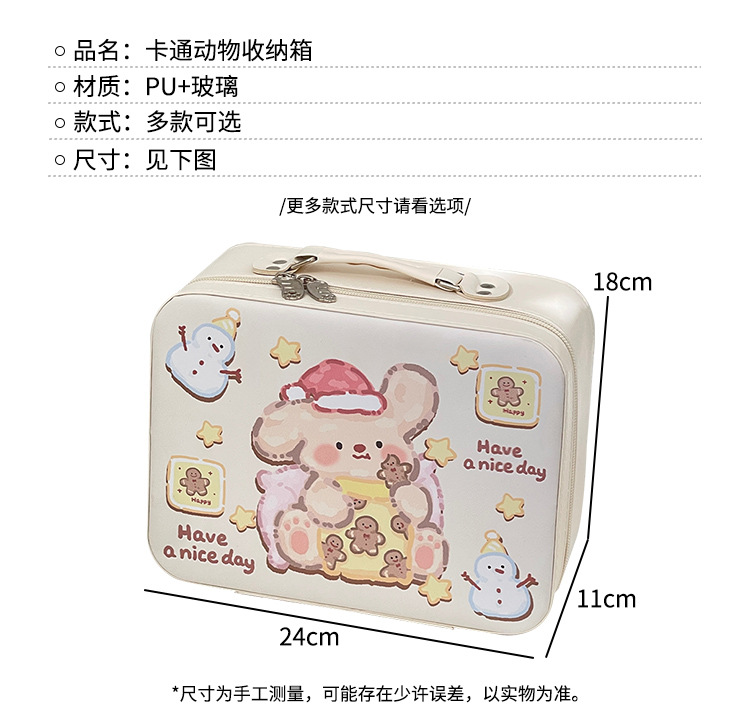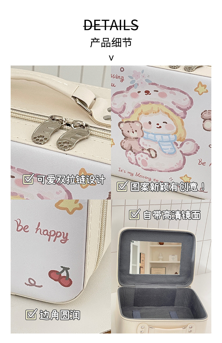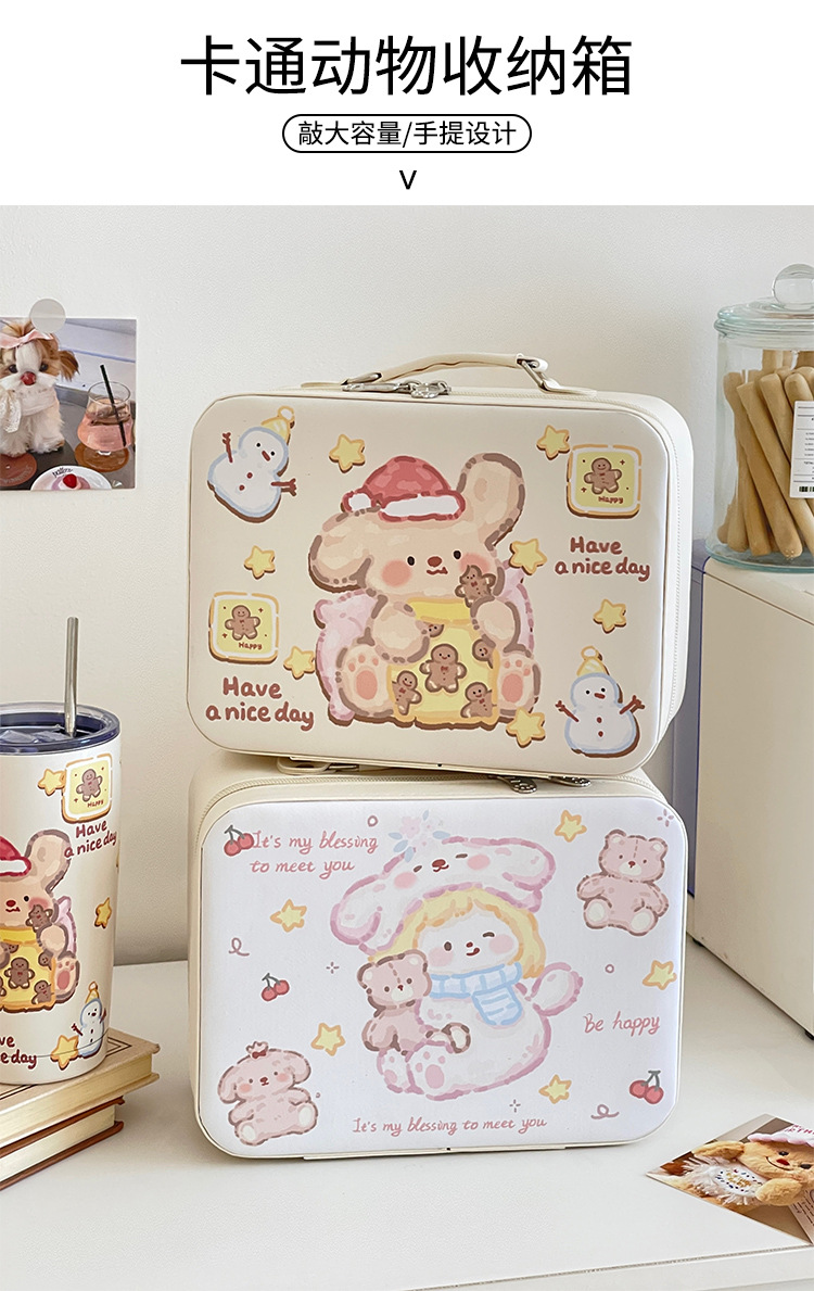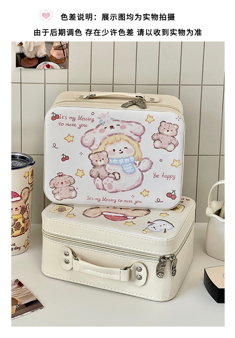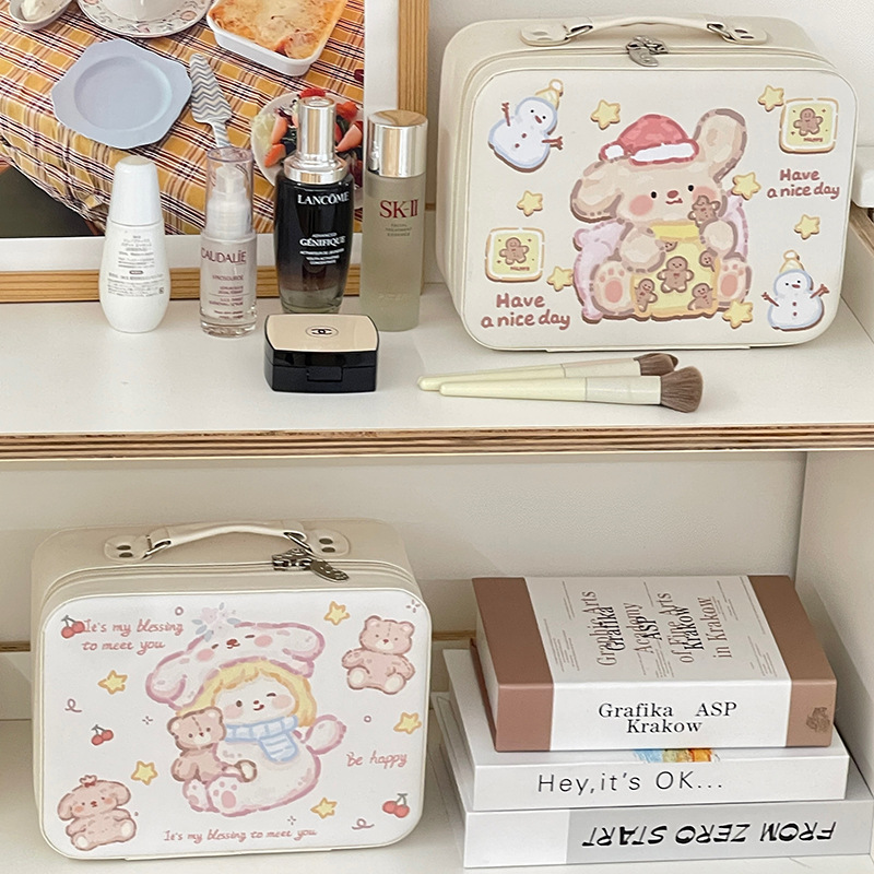 Caja de maquillaje de dibujos animados de alto valor facial portátil de gran capacidad para productos de cuidado de la piel caja de almacenamiento de acabado de cuero pu maleta de almacenamiento