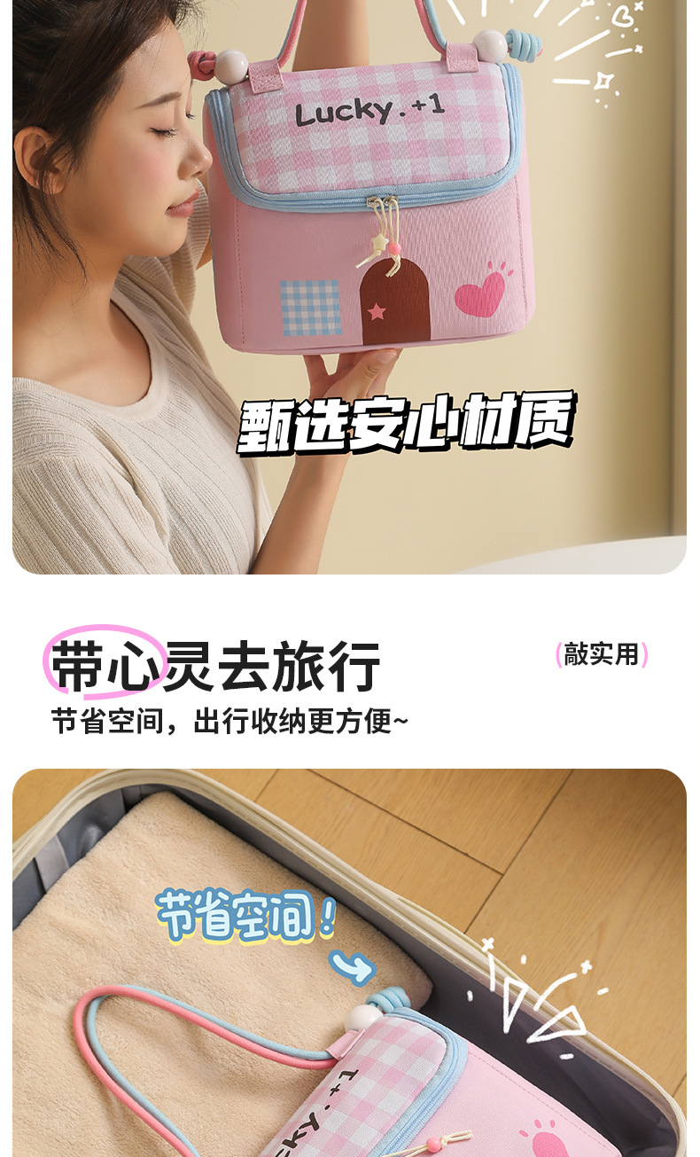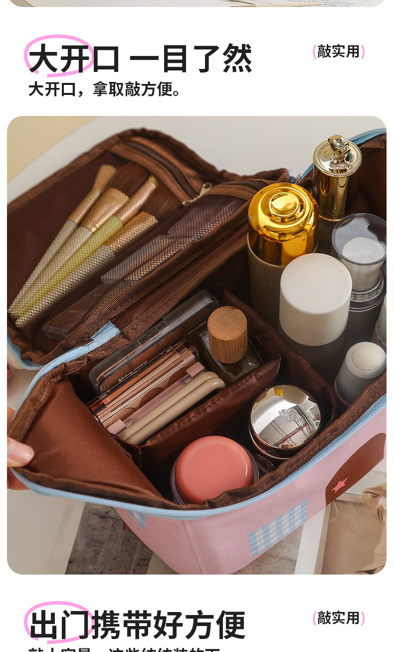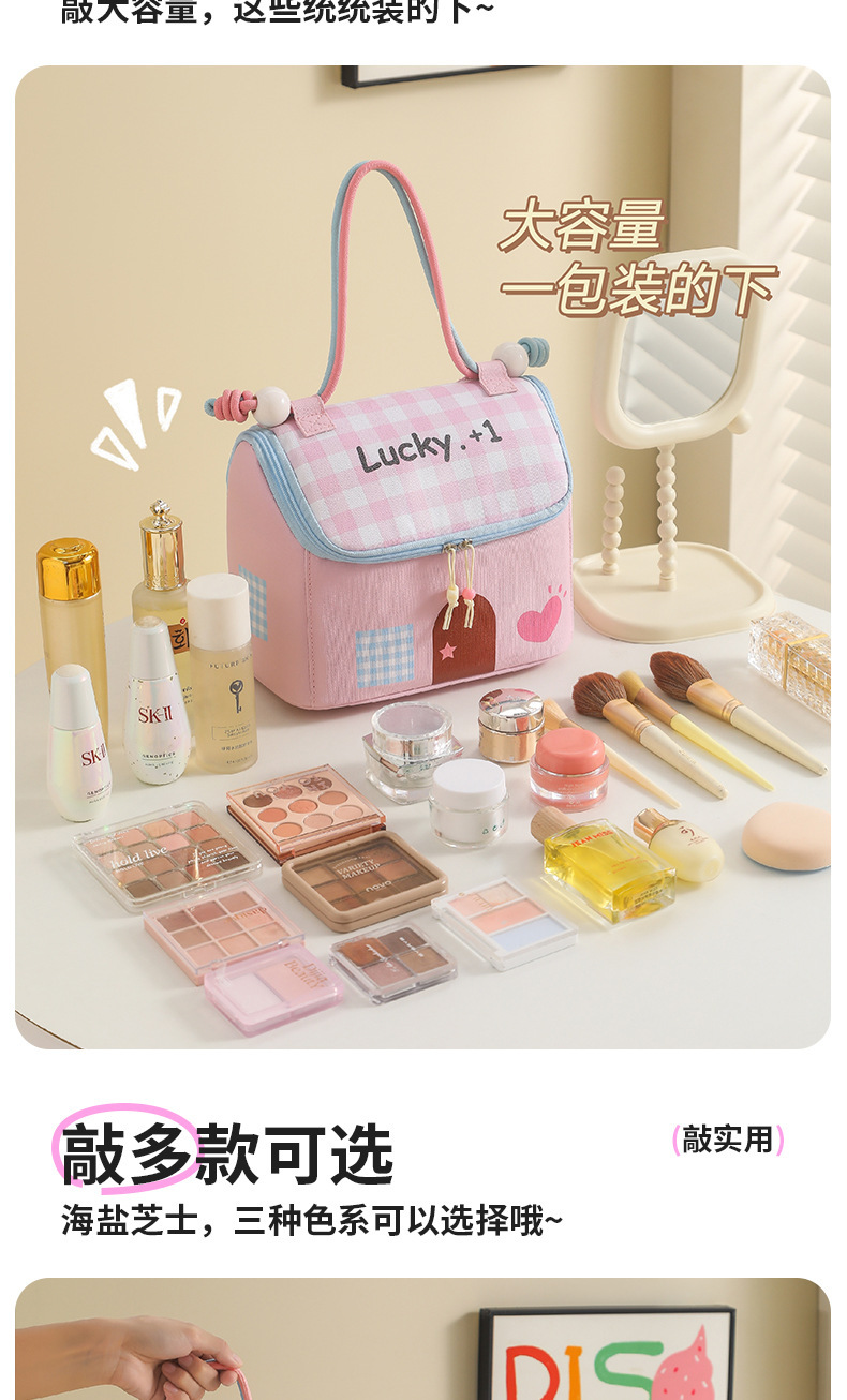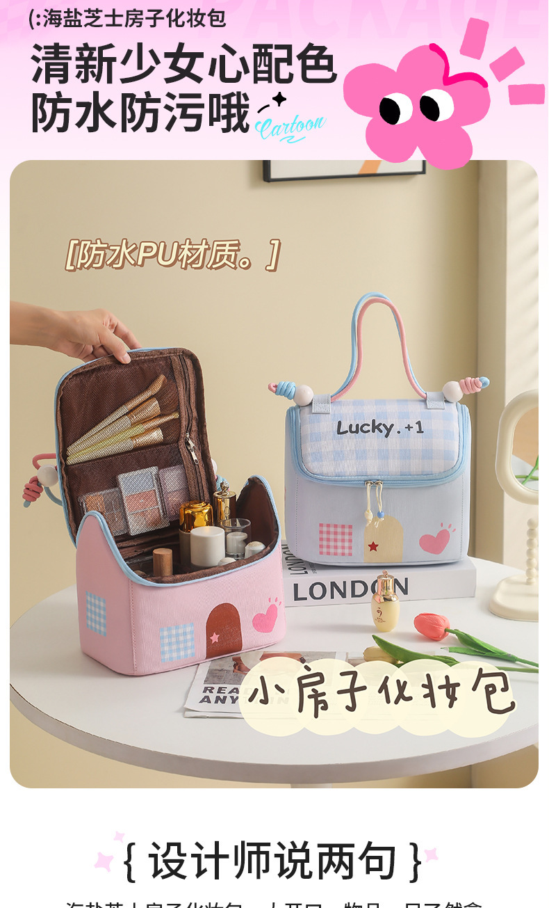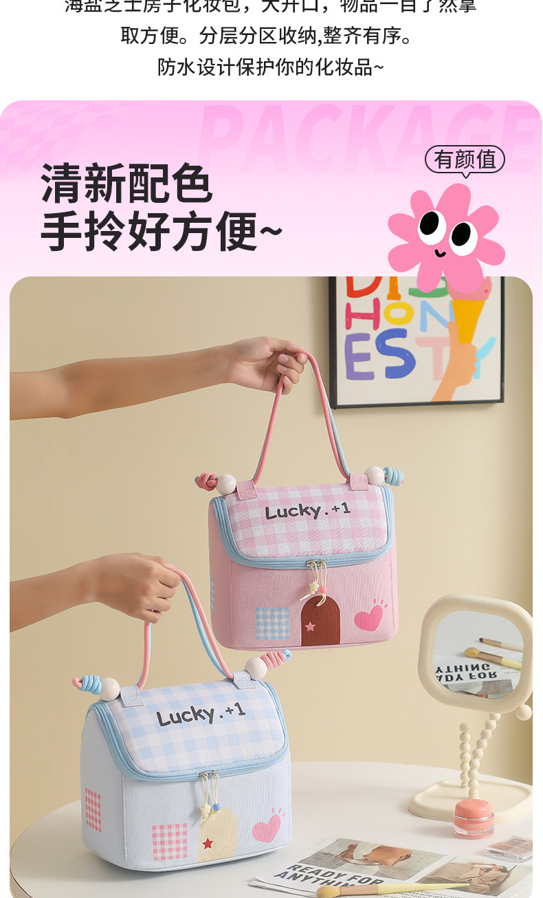 Casa pequeña encantadora bolsa de maquillaje de dopamina color de gran capacidad de partición de almacenamiento de viaje bolsa de almacenamiento portátil bolsa de mano