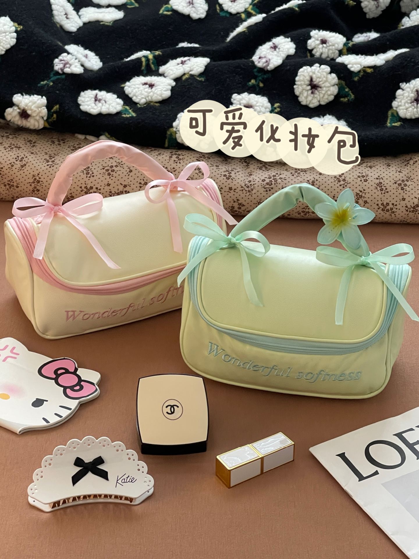 Bolsas de maquillaje de arco blanco en polvo - pequeña, bolsas de maquillaje de arco verde en turquesa - pequeña, bolsas de maquillaje de arco blanco en polvo - grande, bolsas de maquillaje de arco verde en turquesa - grande