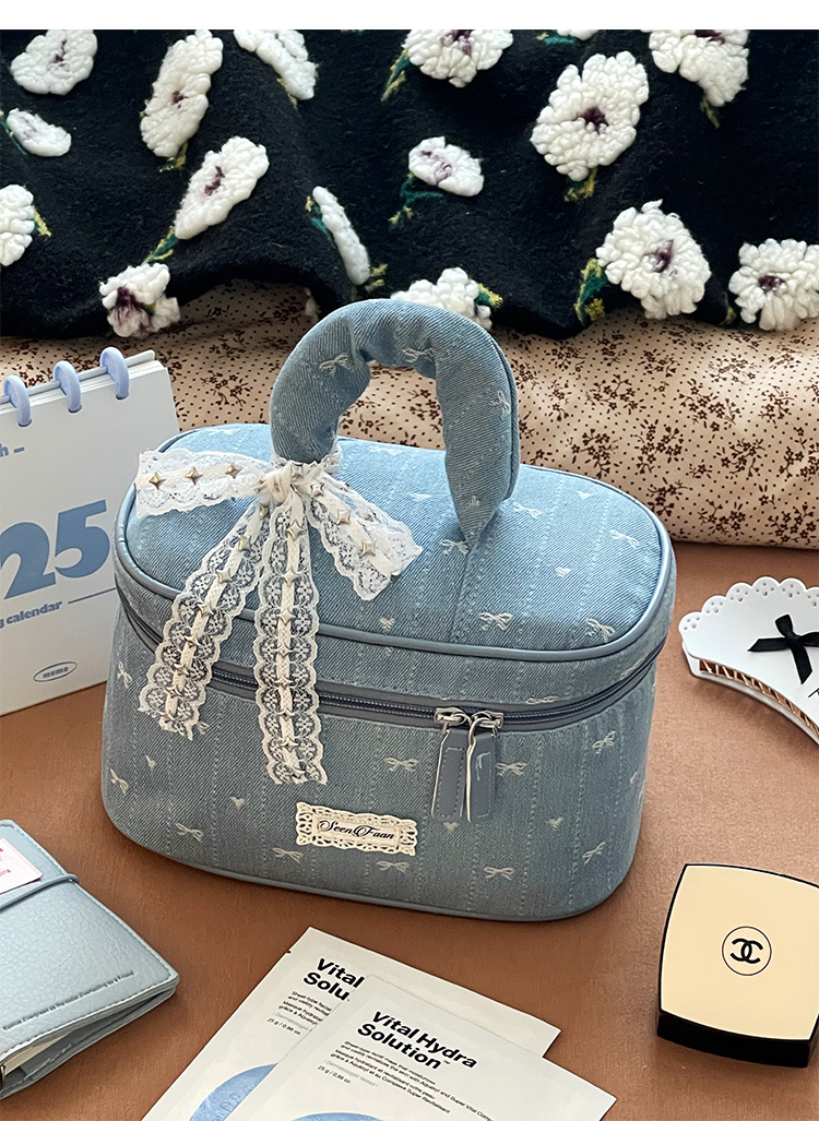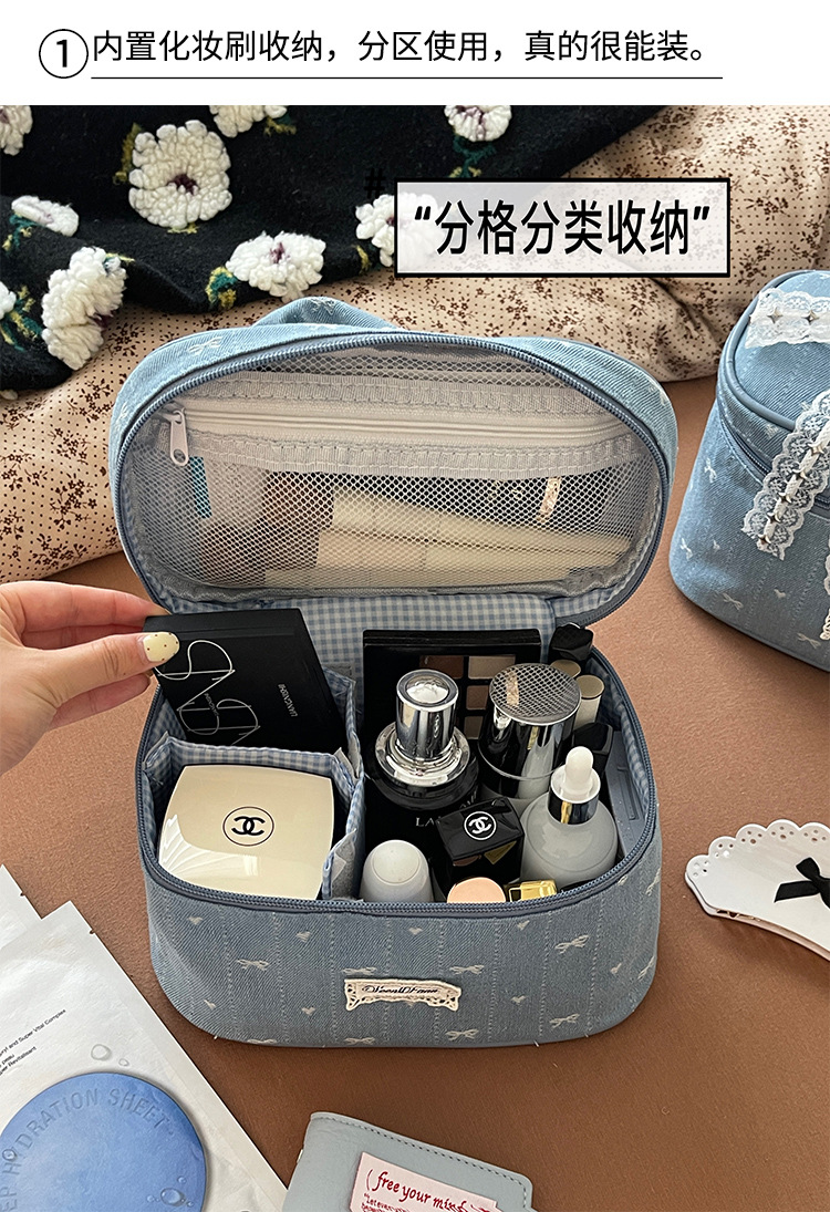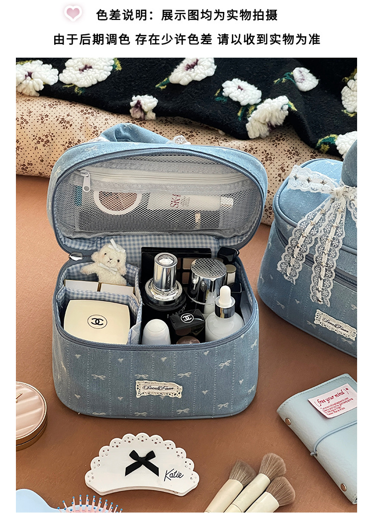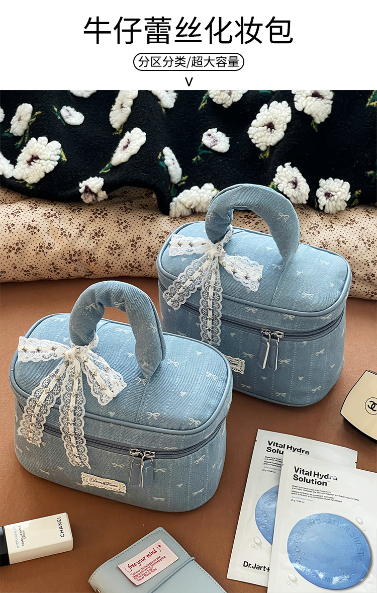 Nueva bolsa de cosméticos portátil de encaje de mezclilla linda, bolsa de lavado de viaje de almacenamiento de cosméticos de gran capacidad portátil