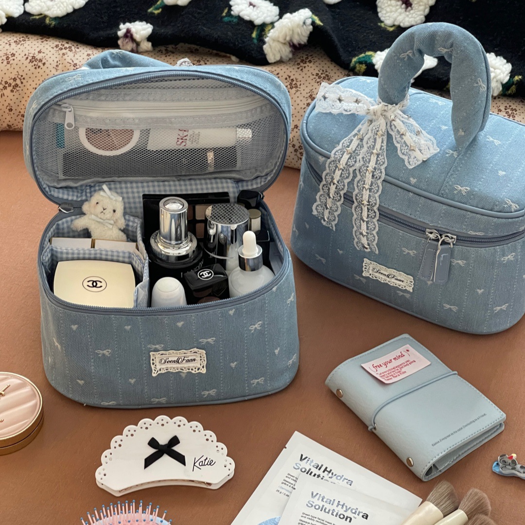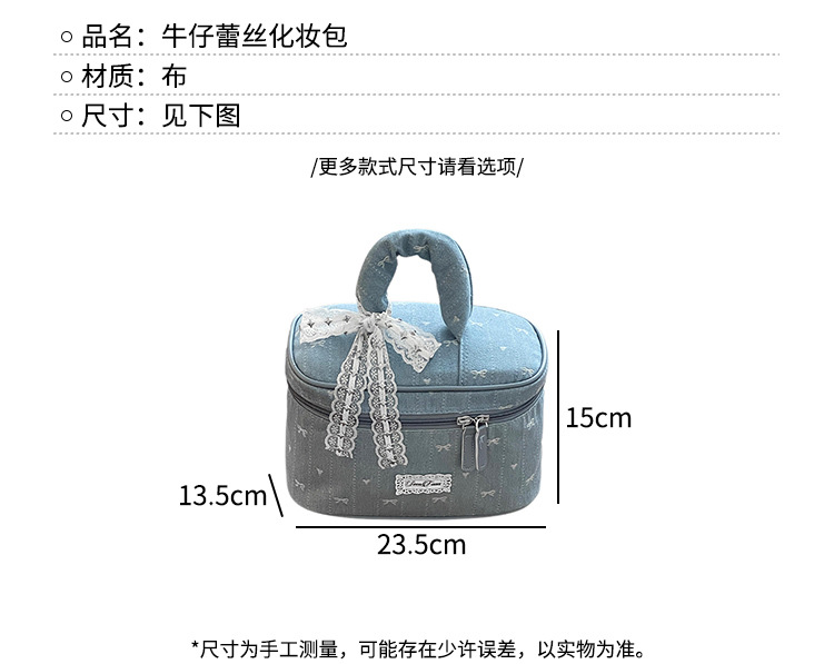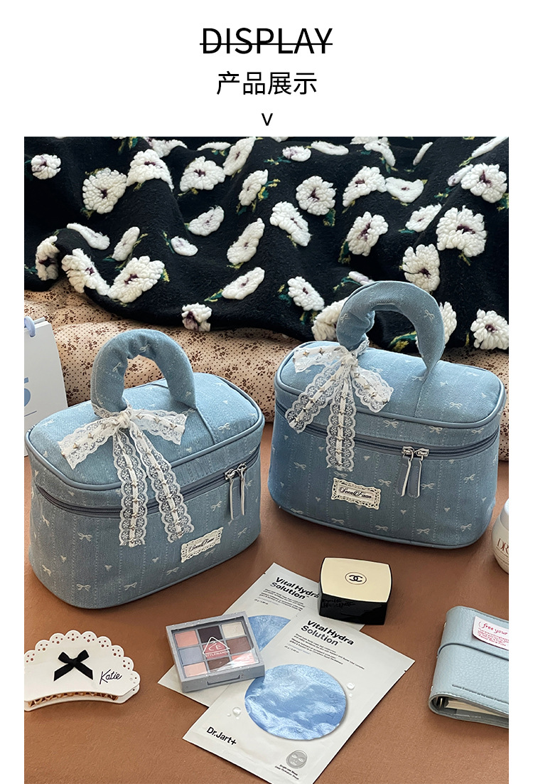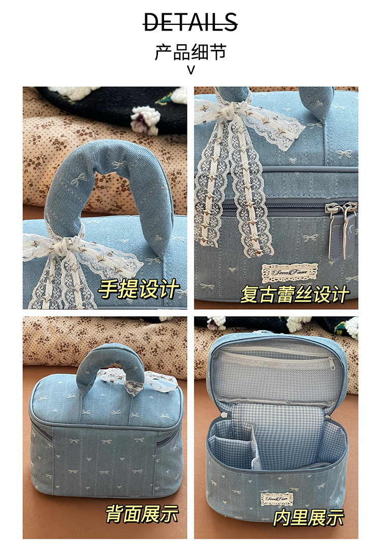 Nueva bolsa de cosméticos portátil de encaje de mezclilla linda, bolsa de lavado de viaje de almacenamiento de cosméticos de gran capacidad portátil