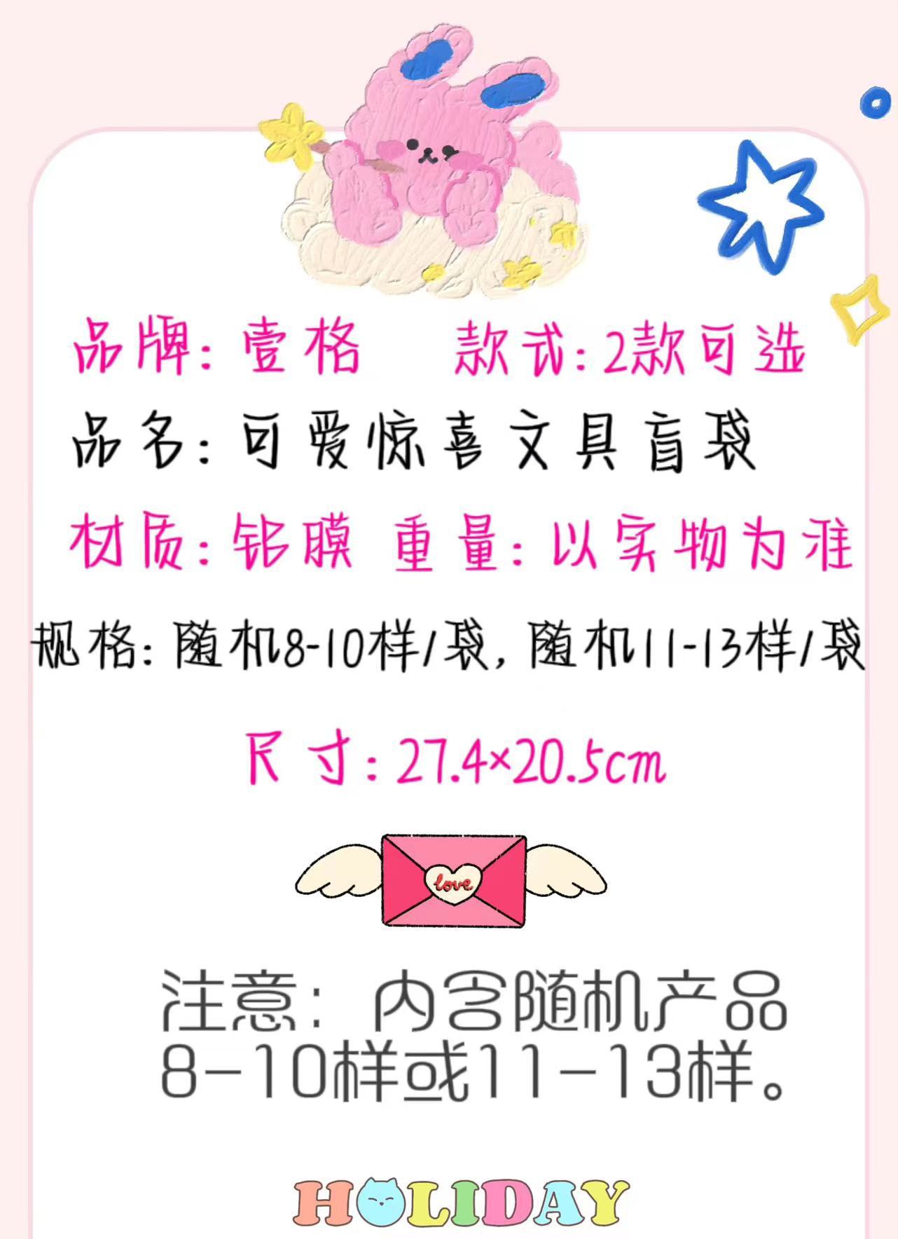 | Especificaciones | Bolsa ciega rosa de la suerte (8-10 tipos),Bolsa ciega de la suerte azul (8-10 muestras),Bolsa ciega rosa de la suerte (11-13),Bolsa ciega de la suerte azul (11-13 muestras) |