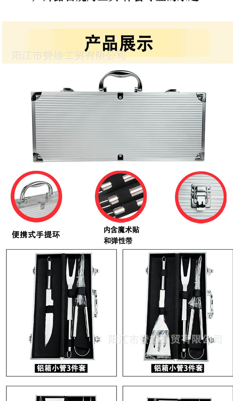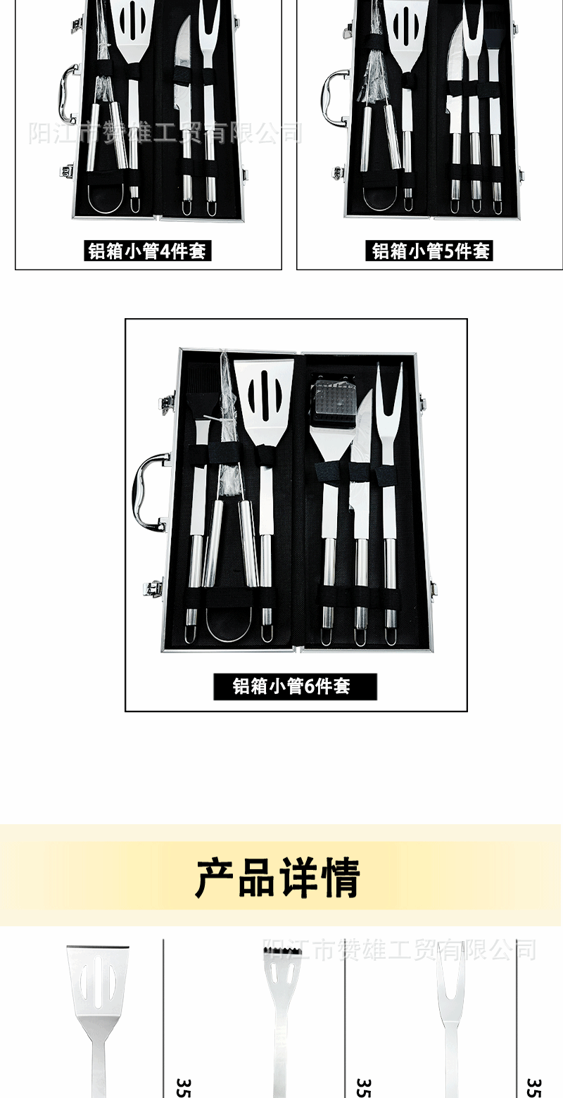 | Especificaciones | Caja de aluminio 3 conjuntos de tubos pequeños (cuchillo, tenedor, abrazadera), caja de aluminio 3 conjuntos de tubos pequeños (pala, tenedor, abrazadera), caja de aluminio 4 conjuntos de tubos pequeños, caja de aluminio 5 conjuntos de tubos pequeños, caja de aluminio 6 conjuntos de tubos pequeños |