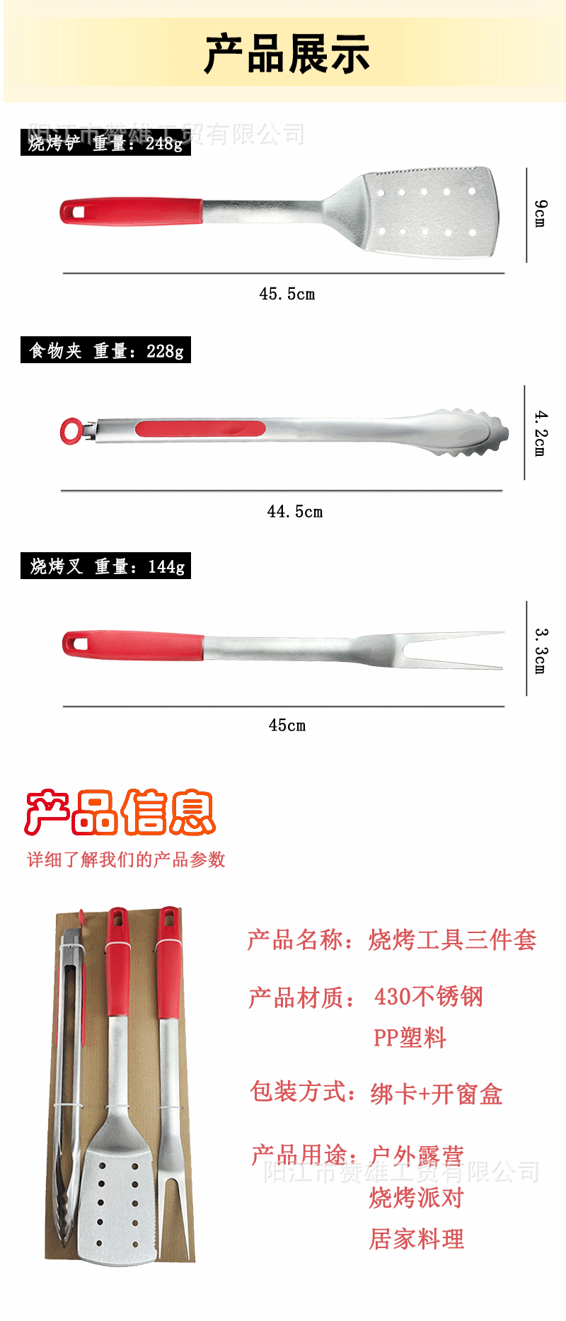 | Especificaciones | Pala de barbacoa, clip de comida, tenedor de barbacoa, juego de caja de ventanas abiertas |