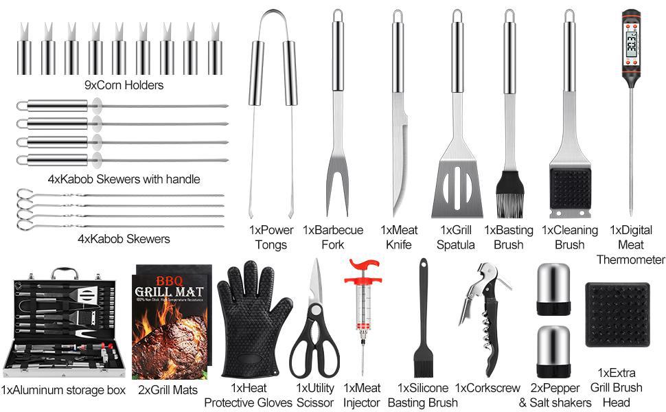 | Especificaciones | Juego de herramientas de barbacoa de acero inoxidable de 34 piezas |