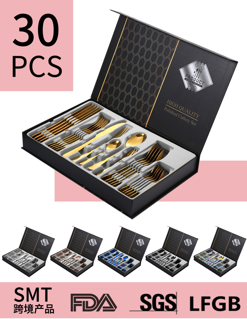 | Especificaciones | Conjunto de 30 piezas de plata,Conjunto de 30 piezas de oro,Conjunto de 30 piezas de oro rosa,Color 30-piece Set,Conjunto negro de 30 piezas,Set de 30 piezas en oro negro,Conjunto de 30 piezas de oro rojo,Conjunto de 30 piezas de oro verde,Set de 30 piezas Blue Gold,Set de 30 piezas en oro rosa,Platino de 30 piezas |