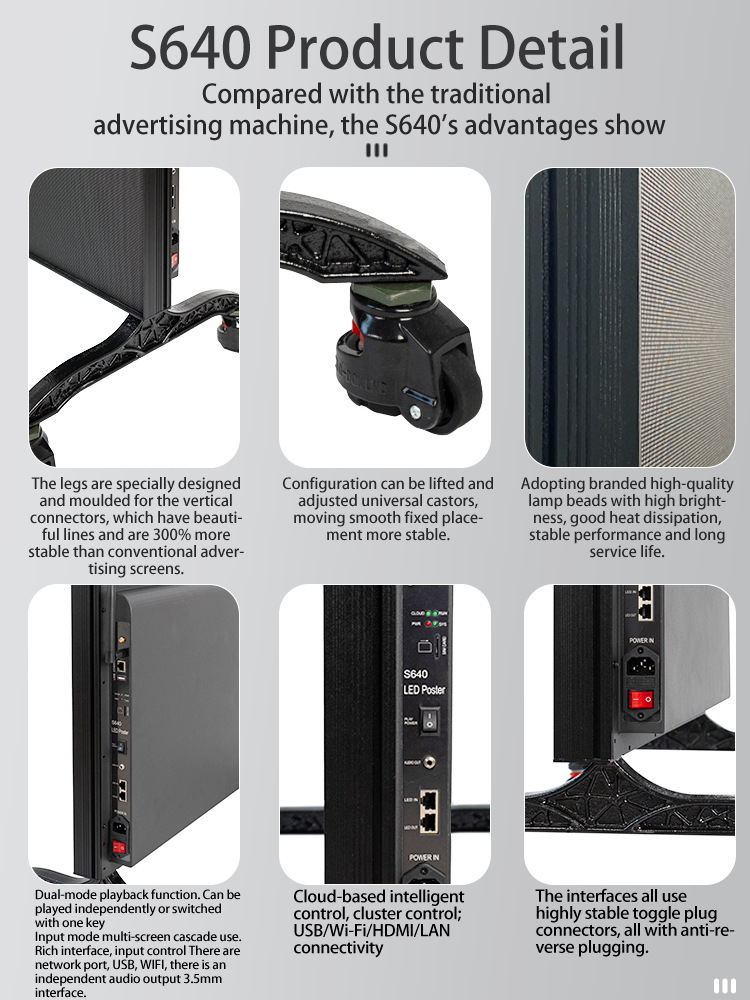 | Especificaciones | S640-P2.5LED Poster Screen,S640PRO-P2.5LED Poster Screen,S640-P2LED Poster Screen,S640PRO-P2LED Poster Screen,S640-P1.86LED Poster Screen,S640PRO-P1.86LED Poster Screen,S640PRO-P1.538LED Poster Screen |