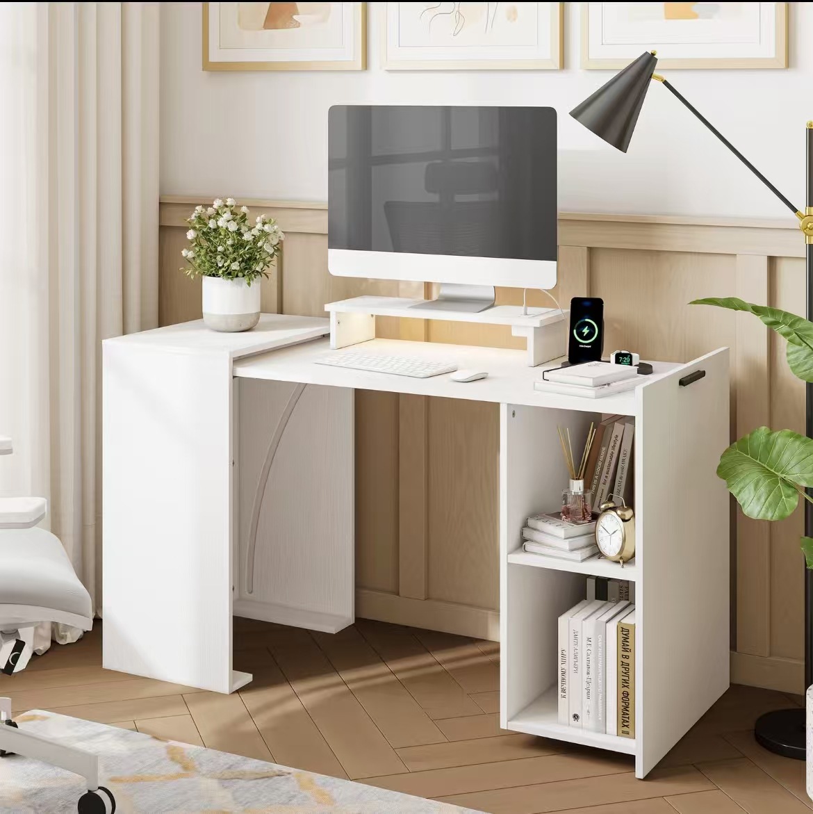 跨境电商亚马逊带三个抽屉和储物架的电脑桌,家庭办公桌带文件抽屉和柜子,带长显示器支架和打印机架的学习桌,行政桌,白色,跨境电商亚马逊木质书桌(白色/黑色):3个抽屉+3个架子,非常适合家庭办公室/书房使用,跨境电商亚马逊带抽屉的电脑桌,白色带储物架的书桌,家庭办公室带存储功能,适合小空间的学习和写作桌子白色/自然色,跨境电商亚马逊白色角落桌90度三角形设计适用于电脑小空间卧室化妆台带储物架和CPU支架节省空间的书写桌,
