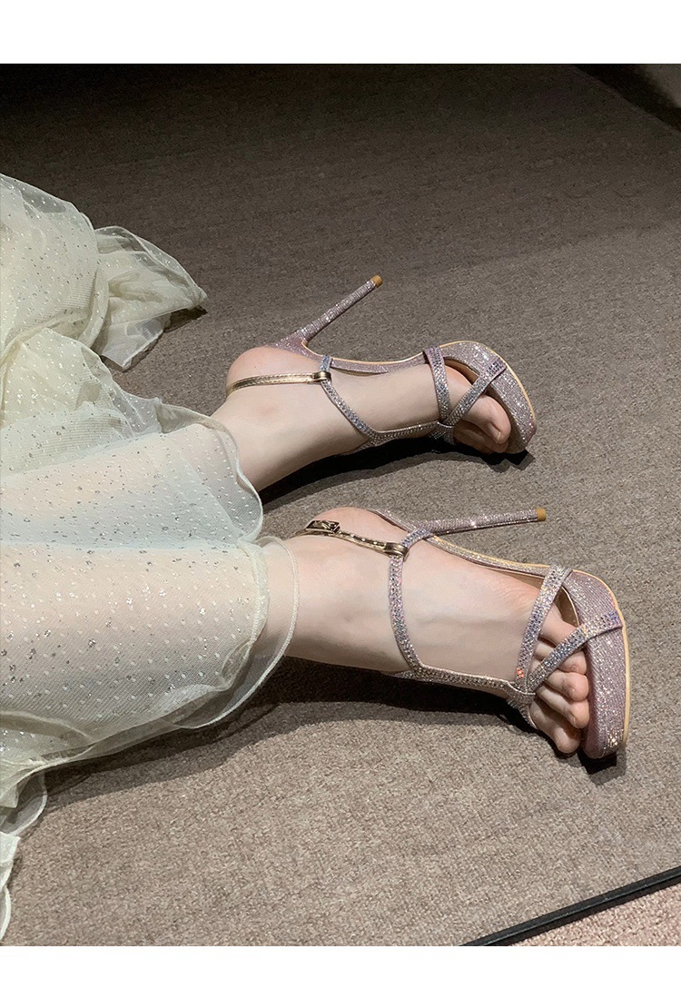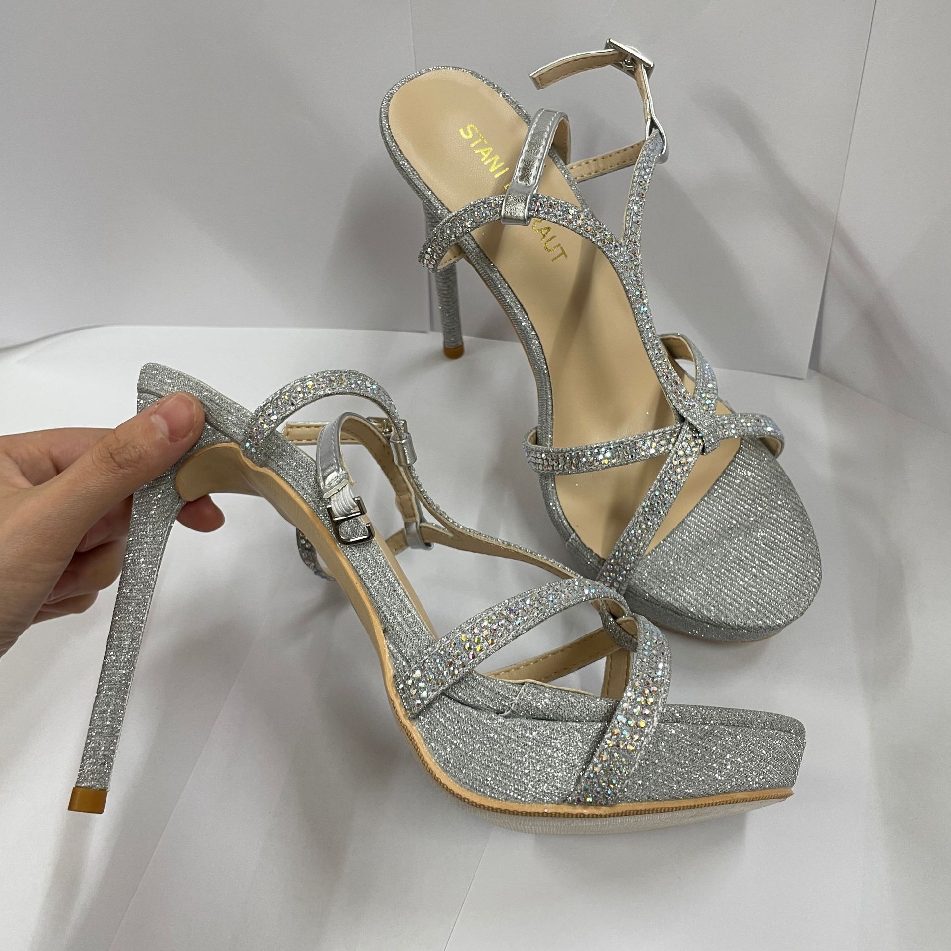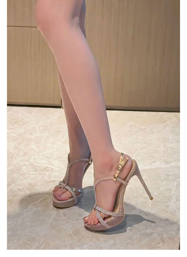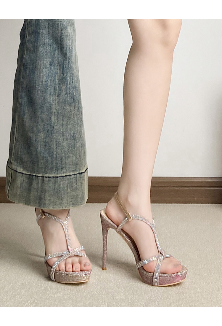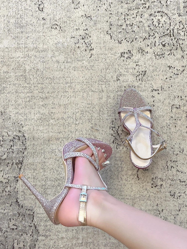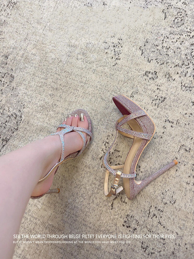Sandalias de Tacón Alto con Punta en Pico y Parte Superior Brillante de Moda Europea y Americana para el Verano 2025, con Pedrería para Fiestas y Bodas