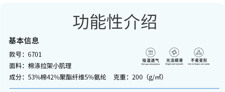 | Función material | Transpiración, resistencia al desgaste, absorción de humedad y sudor, alta solidez del color, otros |