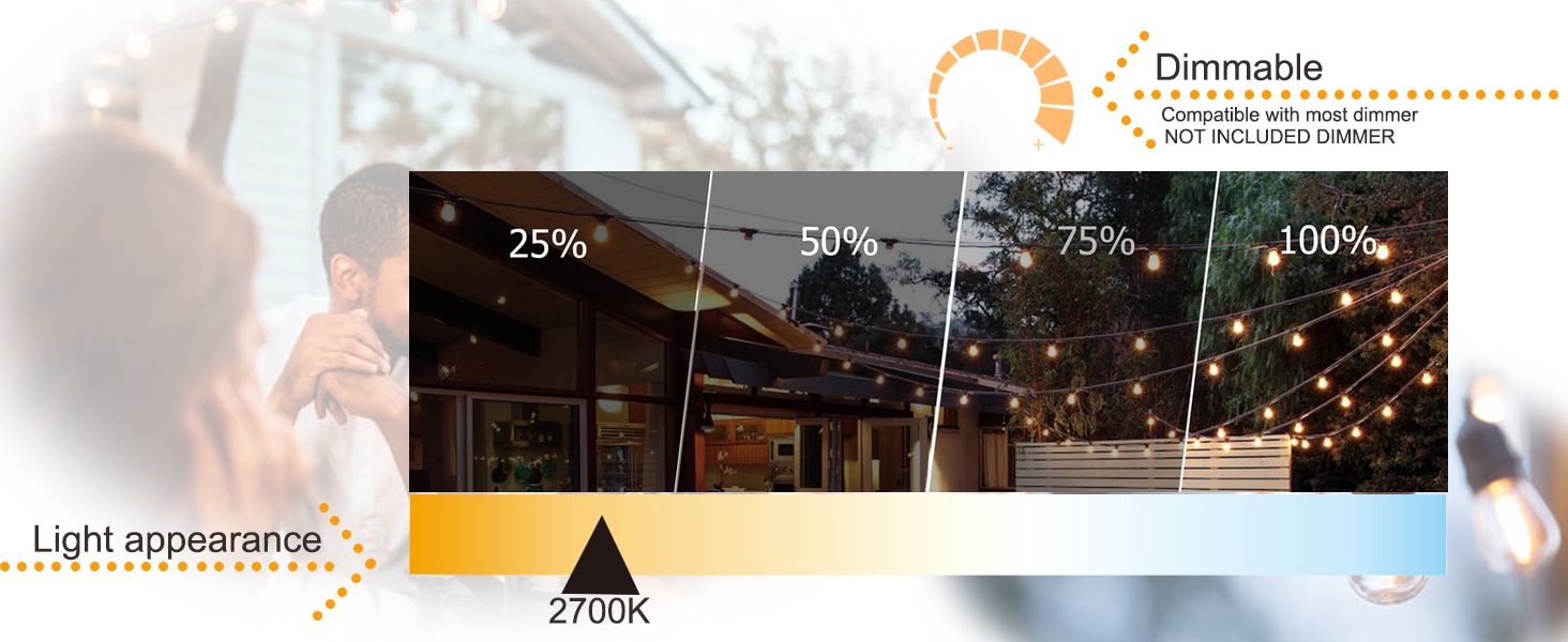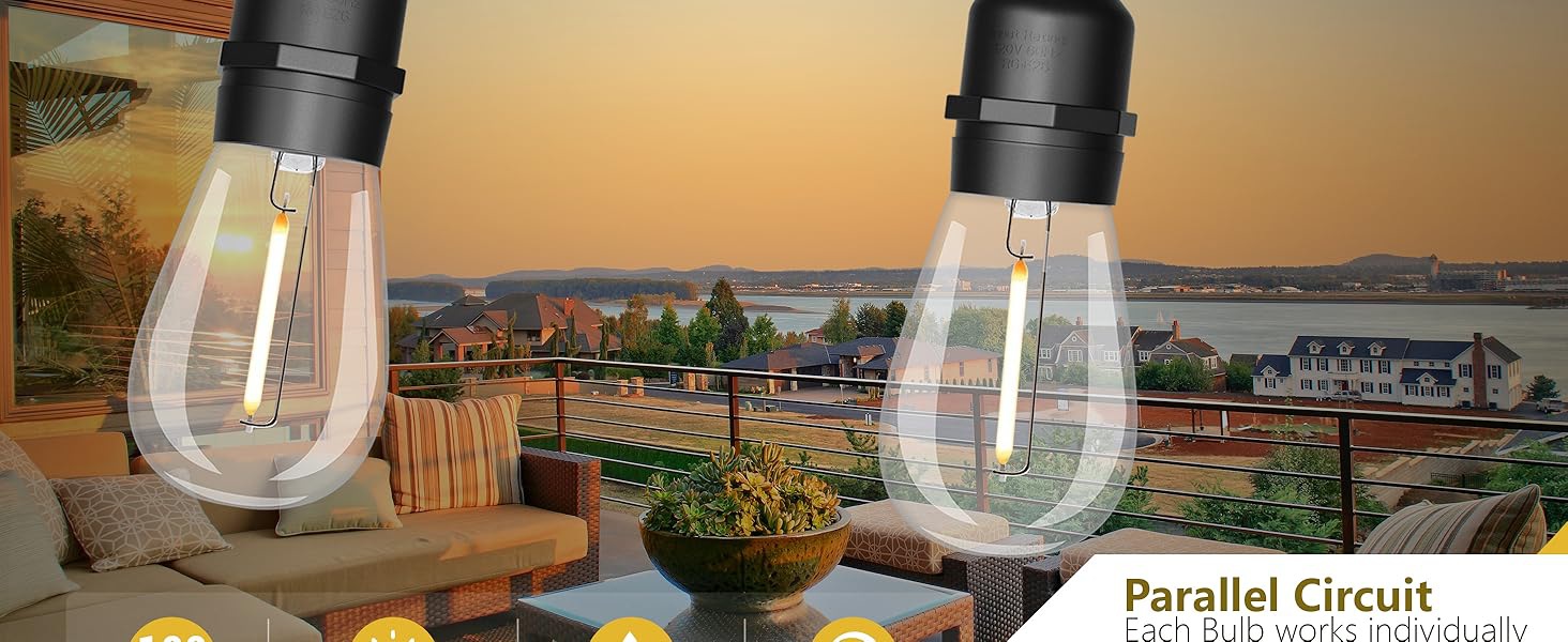 防碎户外灯串营造出愉悦的氛围 - 凉棚的户外灯照亮您的生日派对或其他户外宴会。 当您婚礼、喝酒、跳舞或唱歌时,防碎灯为庭院后院花园露台露台凉亭营造小酒馆咖啡厅氛围。 户外 LED 串灯也可以作为礼物送给您的家人、朋友和客人,商业级重型串灯为户外带来温暖和快乐。 带替换灯泡的防水户外 LED 灯串 - IP65 防水 LED 户外灯串,耐用黑色灯串,可承受多云、潮湿、大风、雾、雨、雪和极端温度天气。 SUFEIMAS 防碎户外灯串包括 2 个塑料替换灯泡,请务必将庭院灯串灯泡拧紧到防风雨插座上,这样可以防止水流入两串灯串之间的关节。 可连接的户外灯串灯 - 100 英尺户外灯串,30 个悬挂插座,3.08 英尺灯泡间距。 悬挂式 30 X 1 瓦 S14 LED 灯泡,E26 中等底座,包括 2 个备用的 1W 可调 Edison 灯泡。 最多可连接 14 串户外 LED 灯串灯。 庭院串灯户外防水可以连接多个灯串,长达 14 X 100 英尺。 节能户外庭院灯串 - 100 英尺户外串灯配有耐冲击和防风雨灯泡,专为室内室外使用。 户外串灯 100 英尺,可用于后院、凉亭、露台、门廊、花园、甲板或泳池区域。 LED 咖啡馆灯 户外串灯 120V 易于安装 LED 户外灯串 – 户外灯串易于设置,我们可以使用天花板挂钩、杯钩或拉链扎带,根据您的需求悬挂市场灯,以聚集形式或直接穿过空间。 30,000 小时超长寿命户外咖啡馆串灯可降低维护成本,比其他庭院灯节能 90% 以上,户外防水。 如果您因任何原因对所购产品不满意,请随时与我们联系。