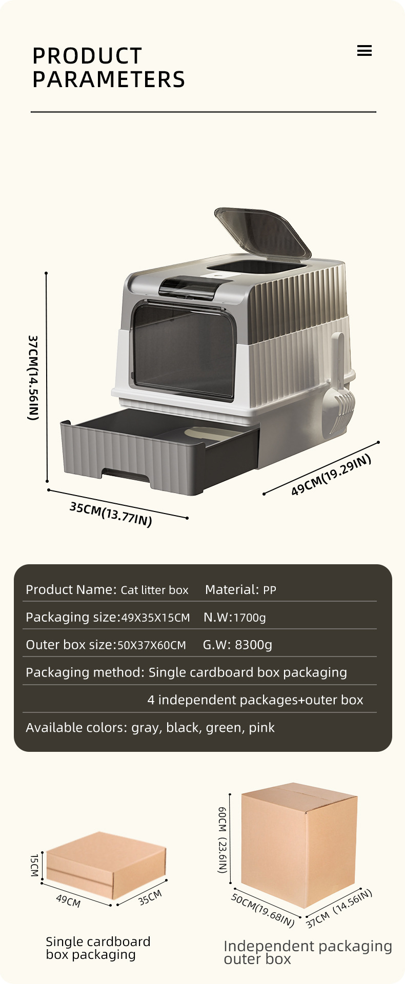 | Especificaciones | La caja de arena para gatos |